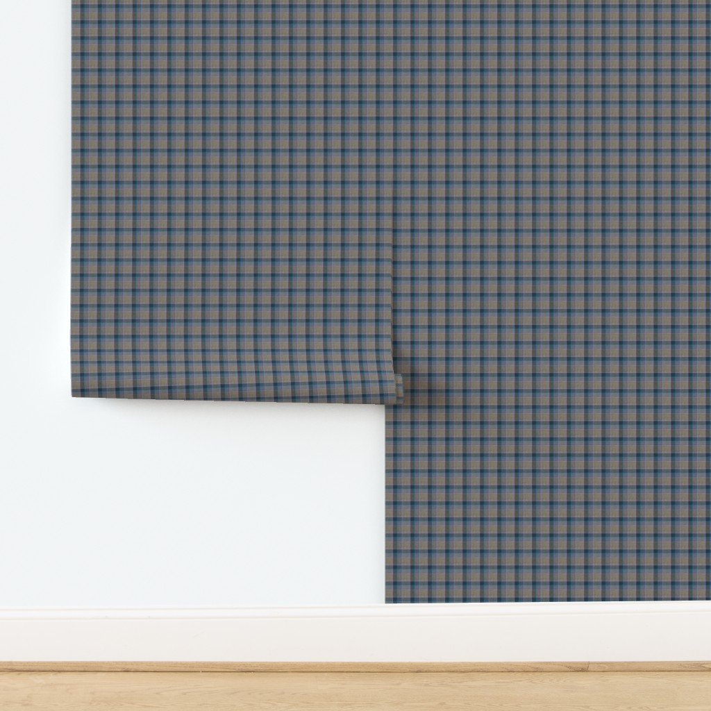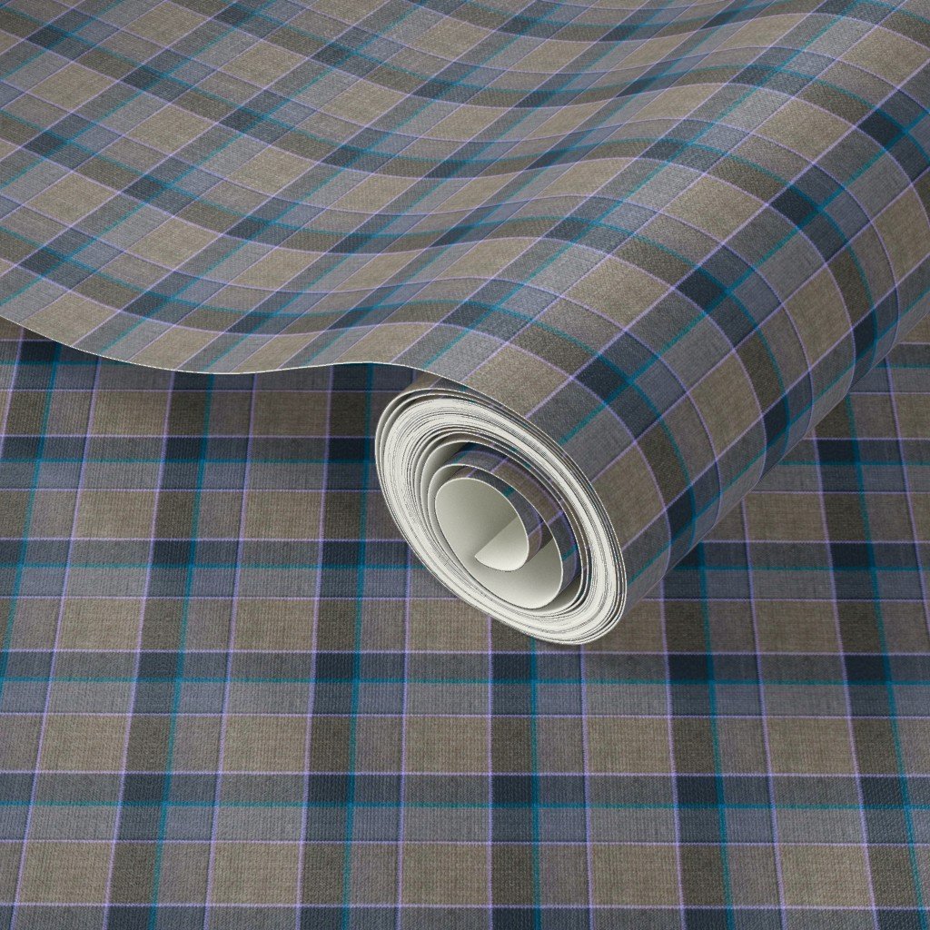 Fraser Weathered Scottish tartan with taupe and teal blue accents, highlighted by soft blue lines. Ideal for home decor or classic upholstery.