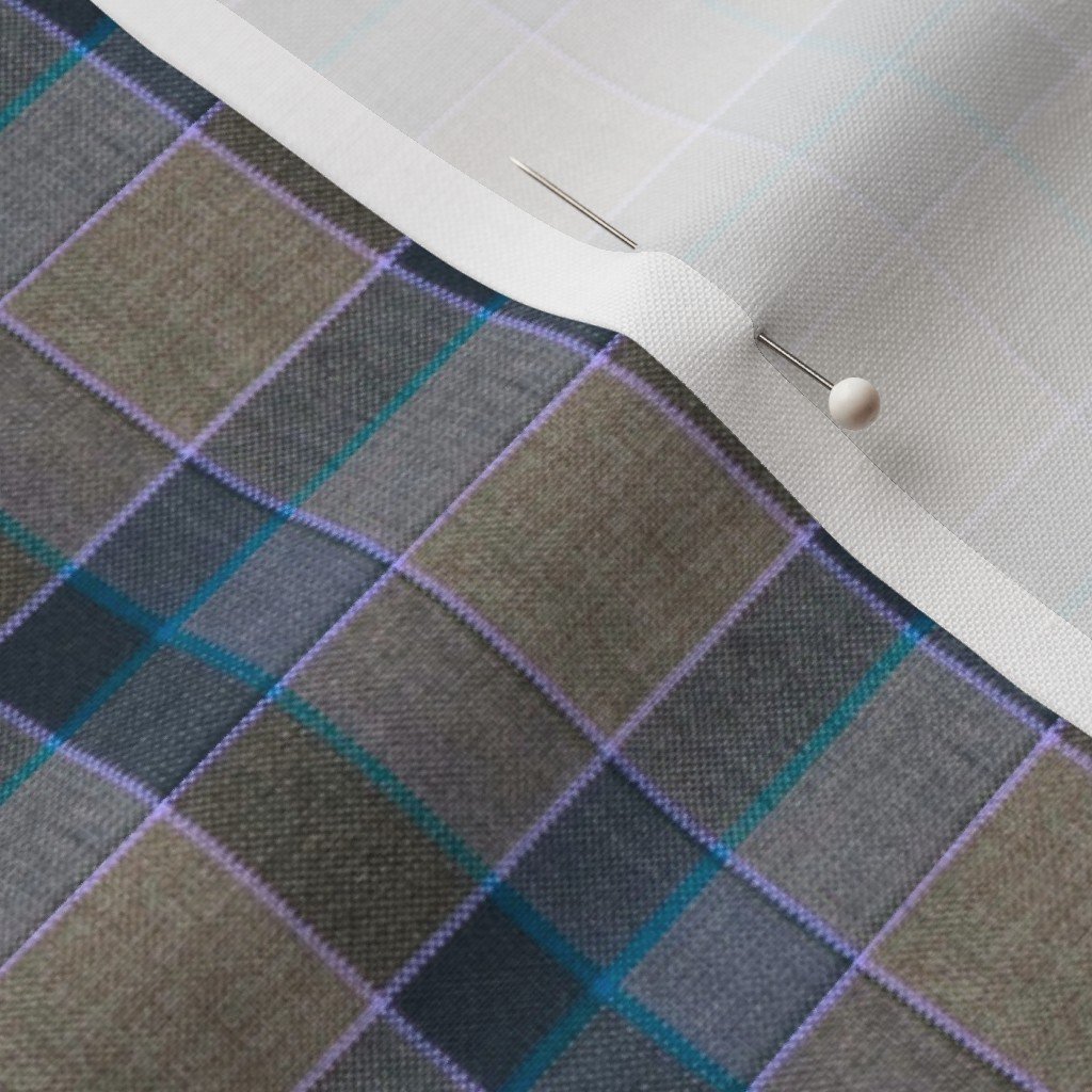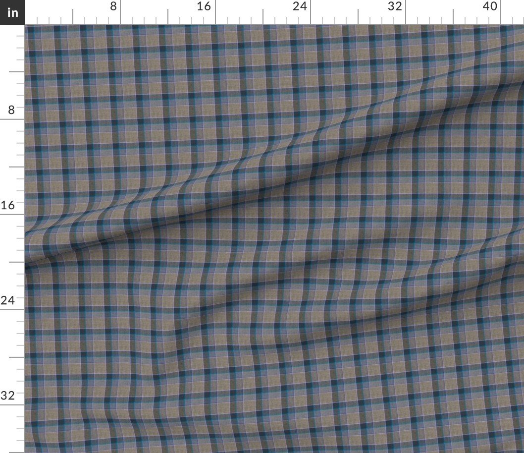 Fraser Weathered Scottish tartan with taupe and teal blue accents, highlighted by soft blue lines. Ideal for home decor or classic upholstery.