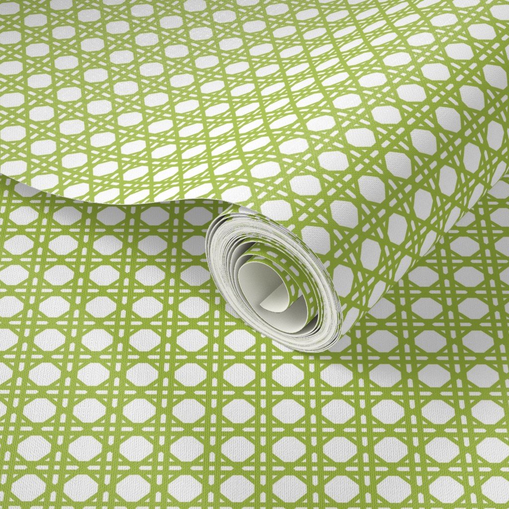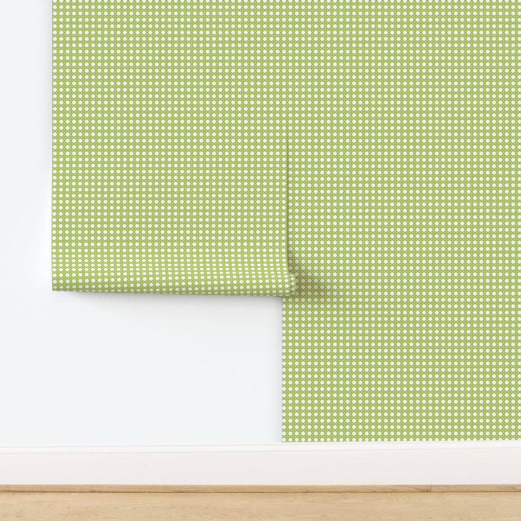 Woven rattan in fresh green on white in symmetrical geometric shapes for French Provincial Spring coordinates