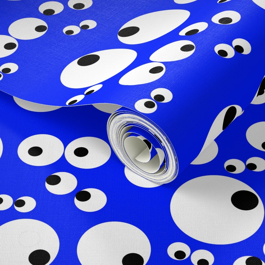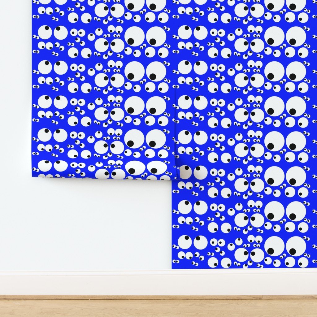 Oodles of googlies goo goo eyes all peeping on a neon electric blue background