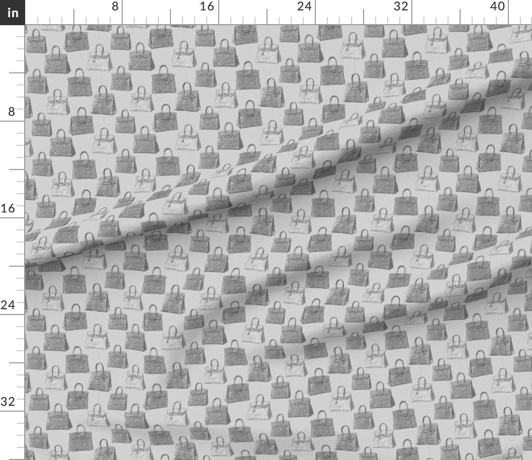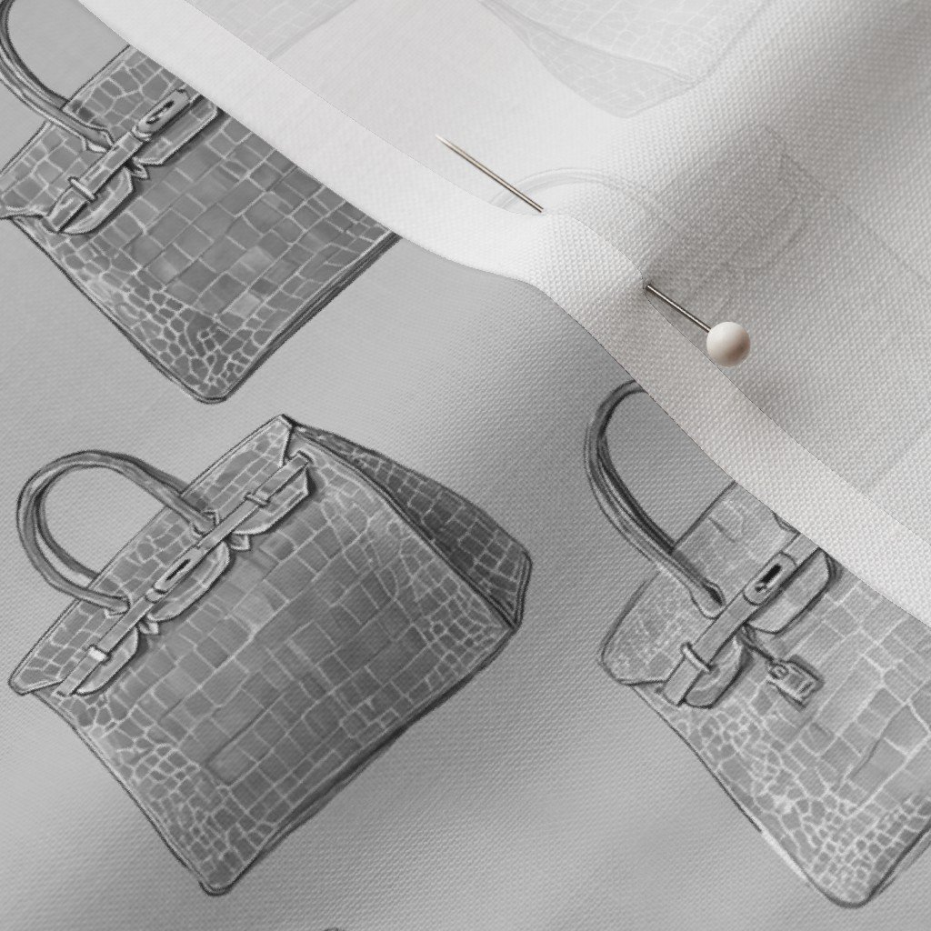 Sophisticated graphite gray handbag silhouettes with detailed croc texture repeat across a soft neutral background. This refined fashion-inspired pattern brings quiet luxury energy to wallpaper, upholstery, and statement interiors.