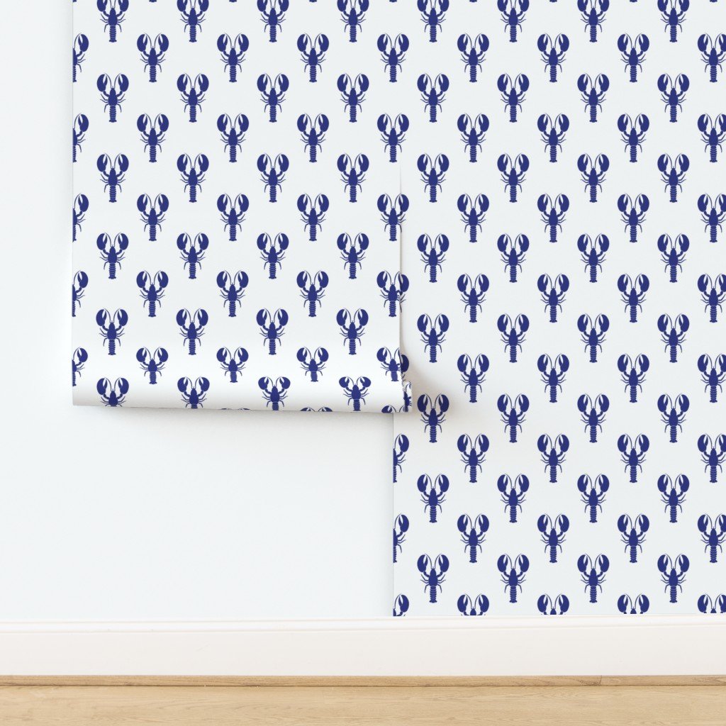 Adorable and whimsical hand drawn motif and symbol of Maine USA lobster in flag blue on white.