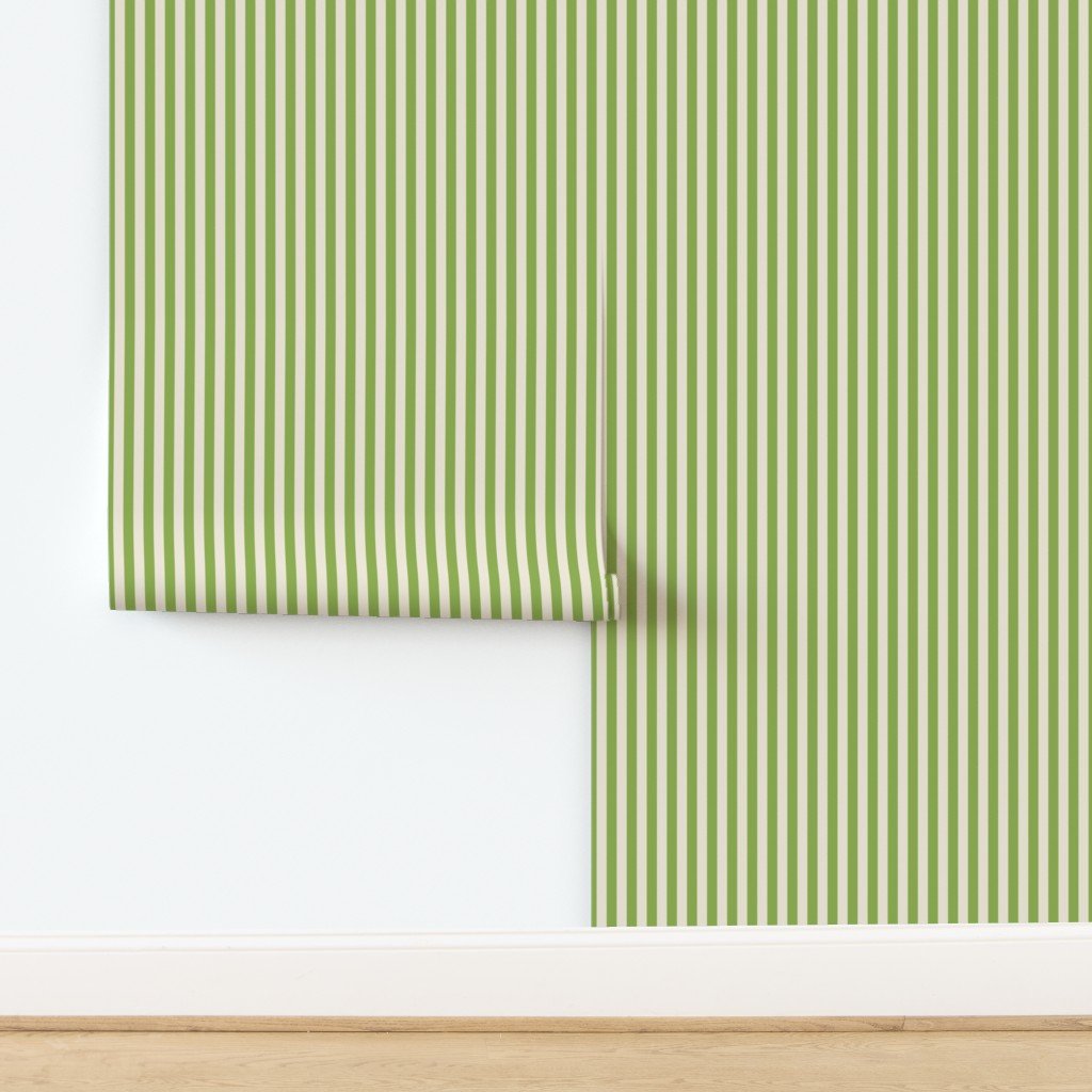 A bold Heritage stripe in Hospital Wall Green set against Warm Oat Cream. The wider 1/2 inch scale creates confident rhythm while the soft neutral ground balances this muted yellow-green tone.