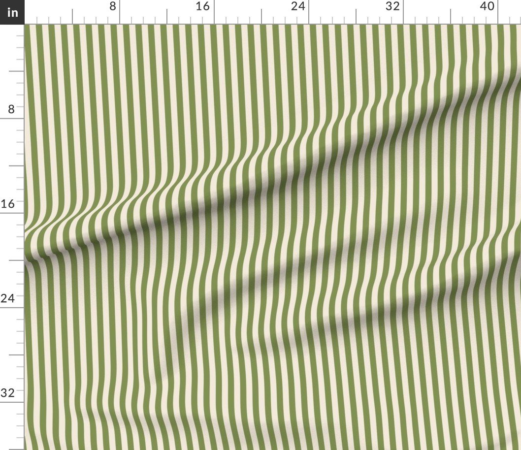 A bold Heritage stripe in Zombie Olive set against Warm Oat Cream. The 1/2 inch stripe creates strong visual rhythm while the soft cream base tempers this earthy olive tone.