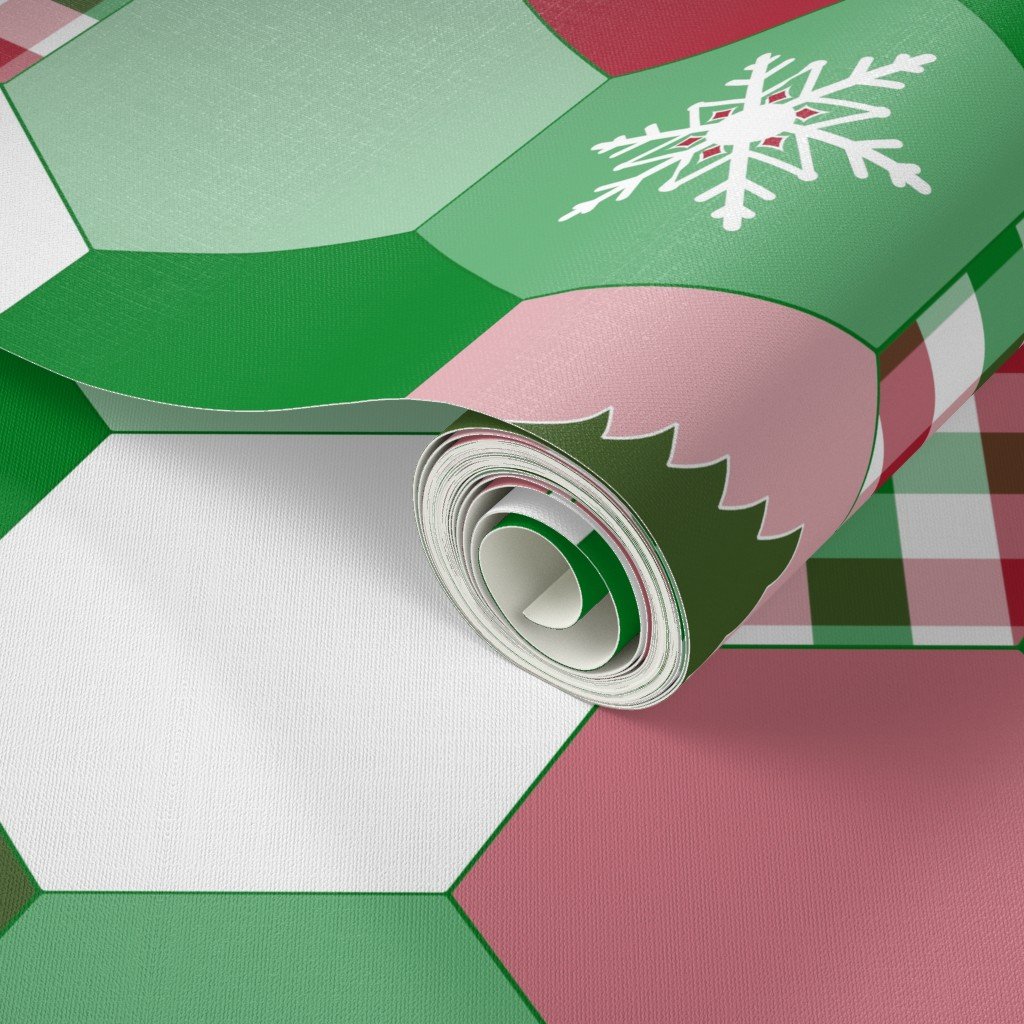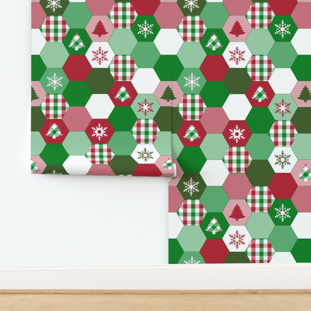 This festive design showcases a seamless pattern of hexagons featuring various red, rose, green and white Christmas-themed elements.trees, snowflakes
