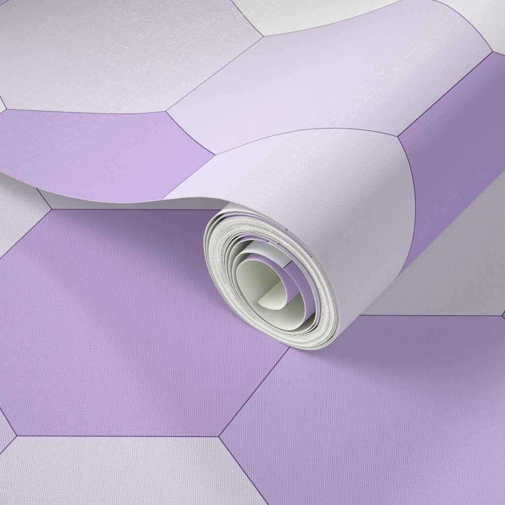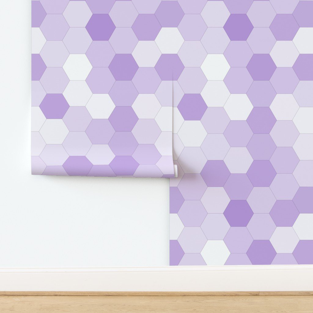 This design presents a seamless pattern of hexagons in a range of lavender tones . The hexagons are arranged in a honeycomb structure.