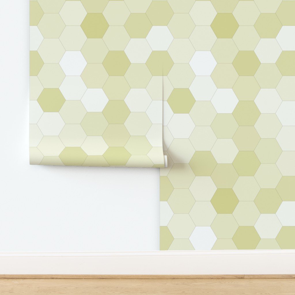 This design displays a seamless pattern of hexagons in various shades of soft yellow. The hexagons are arranged in a honeycomb structure.
