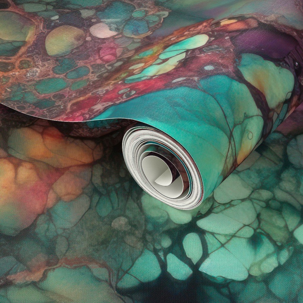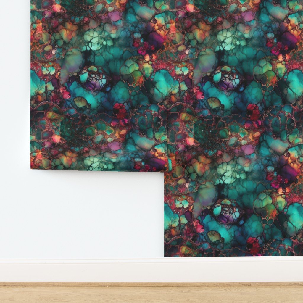 Emerald teal tones blend with ruby, amethyst, and gold veins in this dreamy inky design—ideal for artistic textiles and luxe decor.