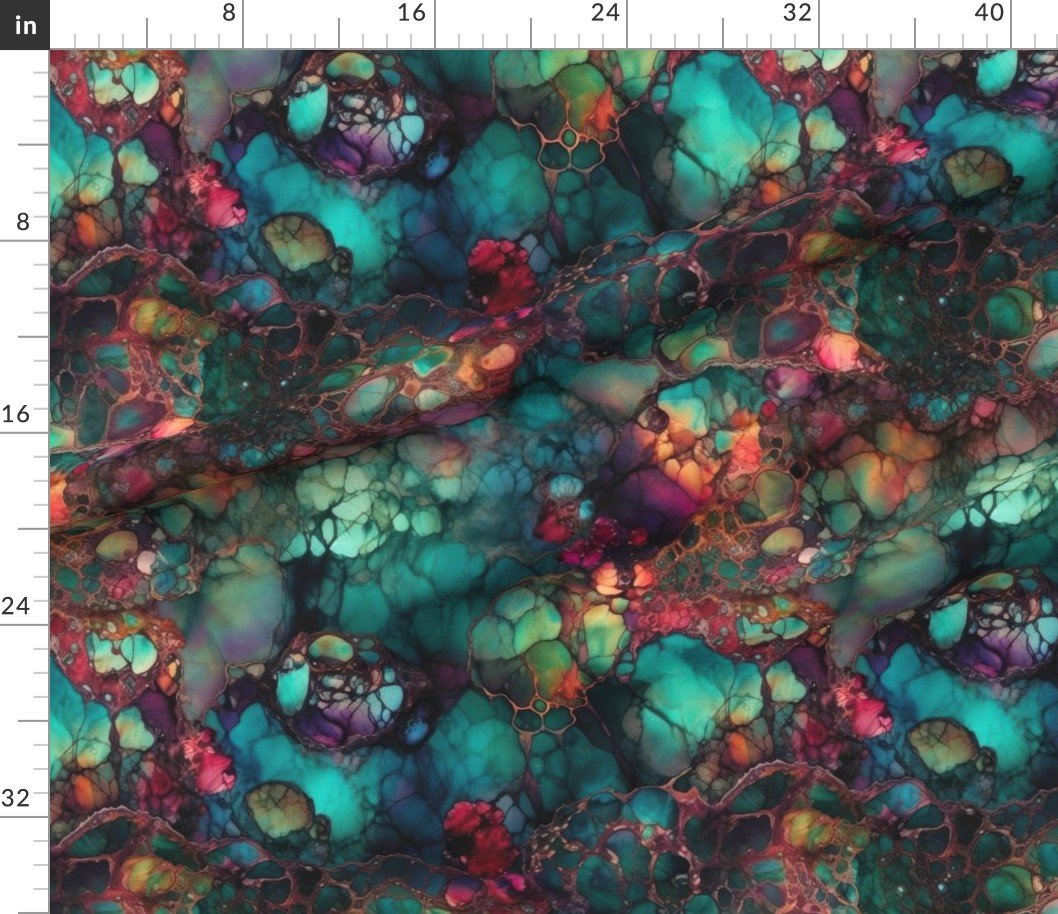 Emerald teal tones blend with ruby, amethyst, and gold veins in this dreamy inky design—ideal for artistic textiles and luxe decor.