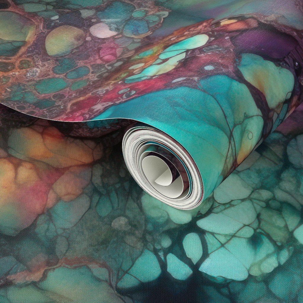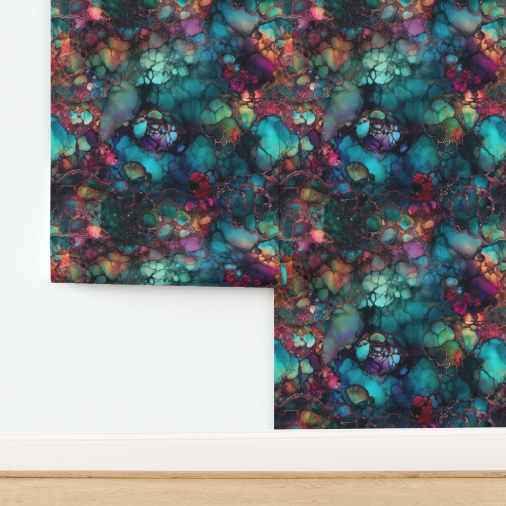 Lush swirls of teal, opal blue, and purple with gold veins create an abstract, inky design perfect for bold textiles and rich decor.