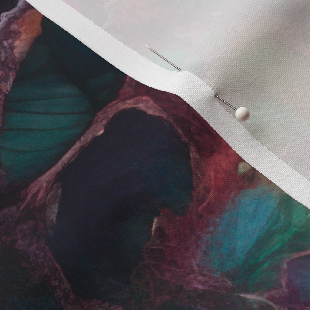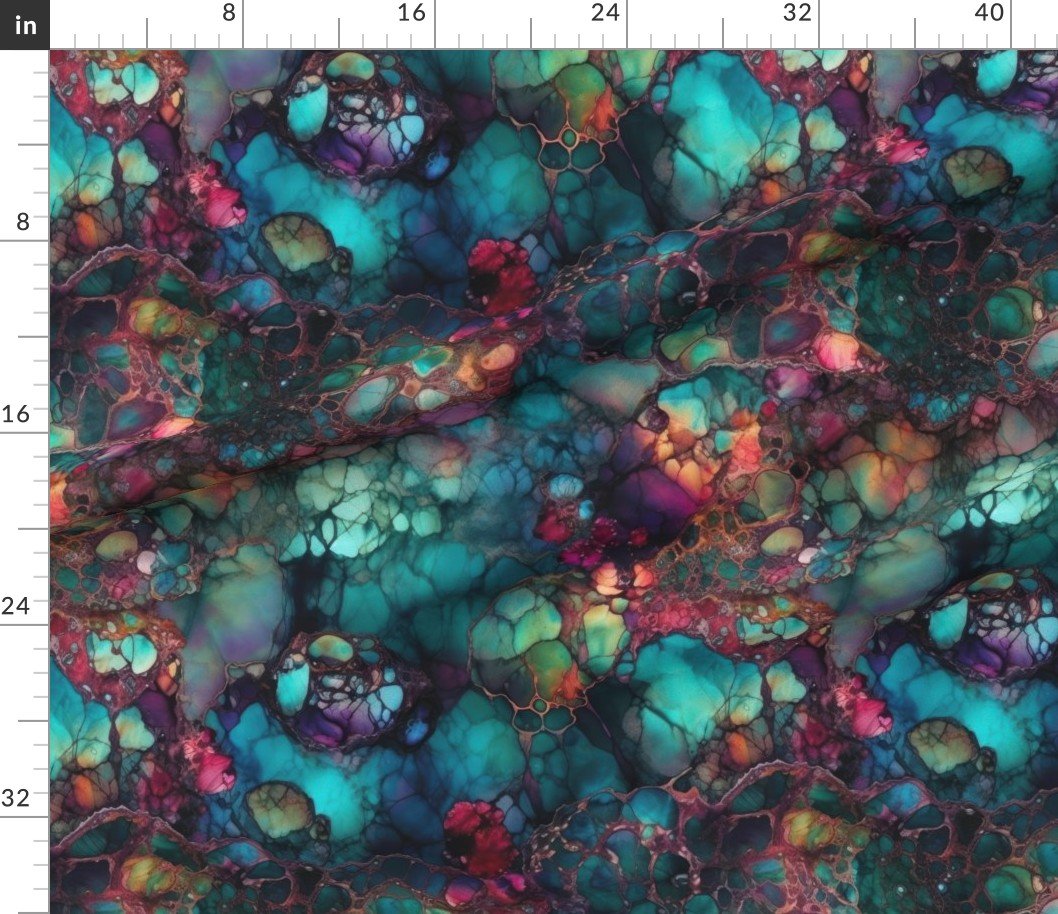 Lush swirls of teal, opal blue, and purple with gold veins create an abstract, inky design perfect for bold textiles and rich decor.