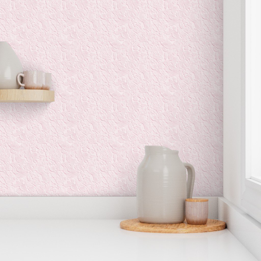 This Jacquard lace floral pattern is rendered in pale blush pink, highlighting woven floral forms with a soft watercolor finish. Romantic and timeless, this lace inspired design works beautifully for weddings, baby decor, nursery fabrics
