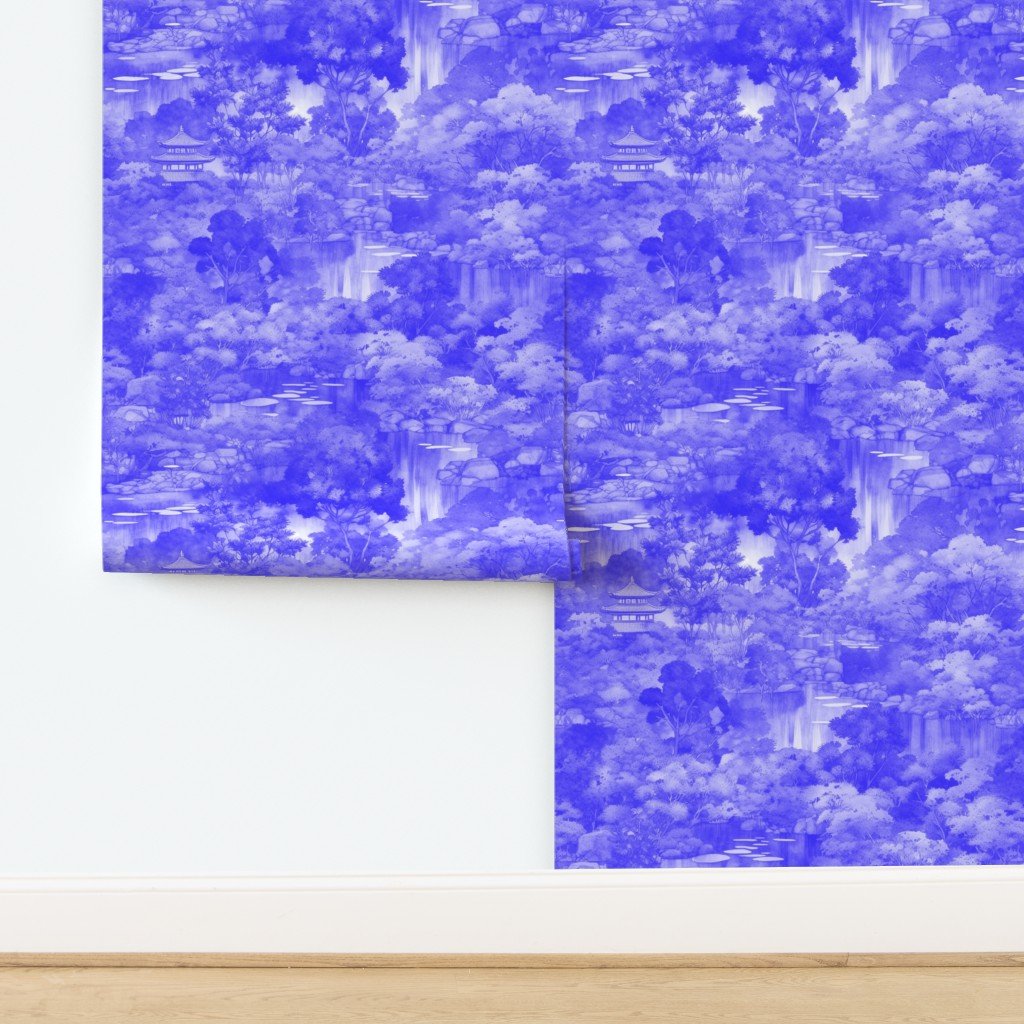 Graceful Oriental temples, trees and waterfalls in a tranquil Japanese water garden setting
