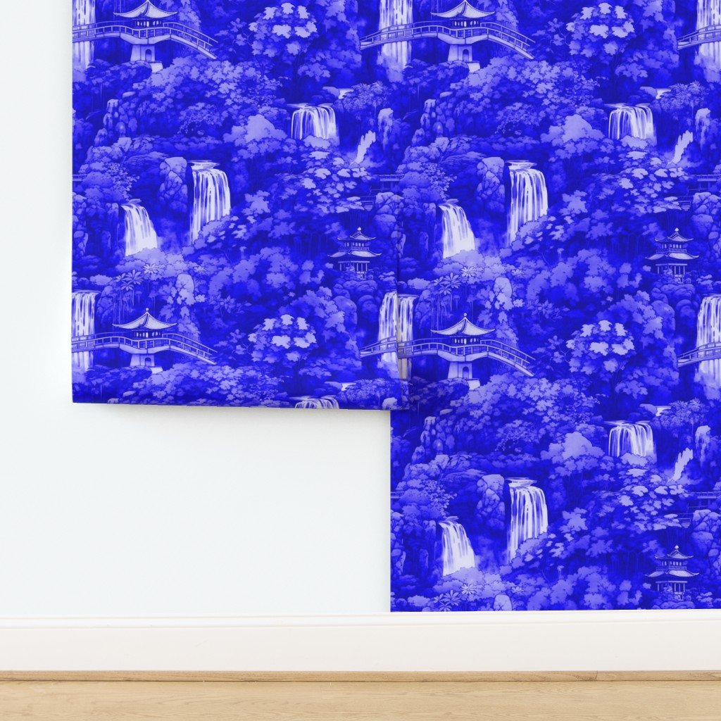 Graceful Oriental style trees and waterfalls in a tranquil Japanese water garden setting