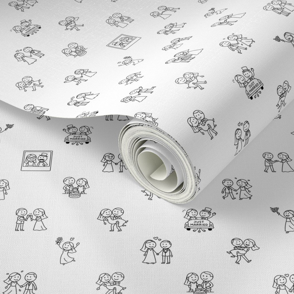 A joyful black-and-white repeat pattern featuring hand-drawn stick figure couples on their big day—cutting the cake, tossing the bouquet, kissing, dancing, and driving off in a “Just Married” car! This playful doodle-style design brings charm and humor