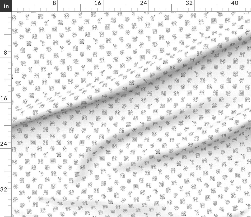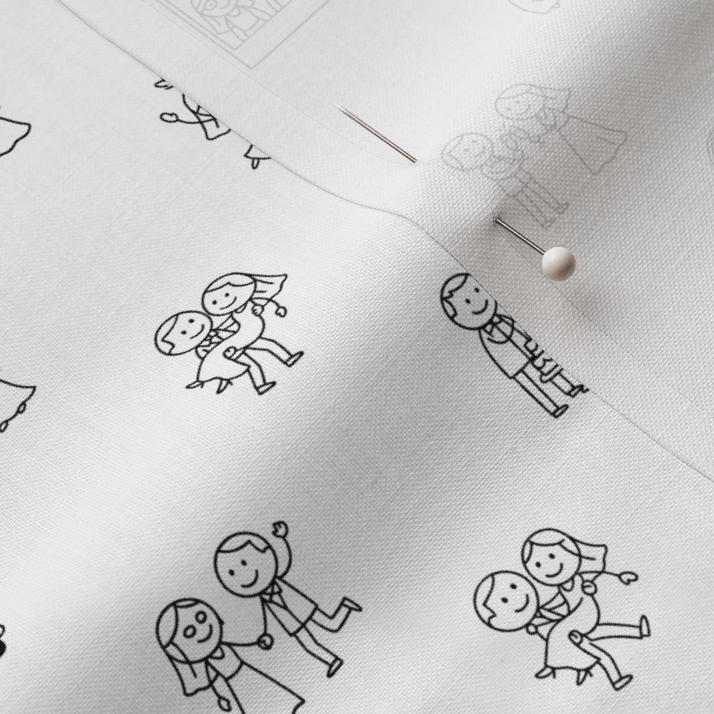 A joyful black-and-white repeat pattern featuring hand-drawn stick figure couples on their big day—cutting the cake, tossing the bouquet, kissing, dancing, and driving off in a “Just Married” car! This playful doodle-style design brings charm and humor