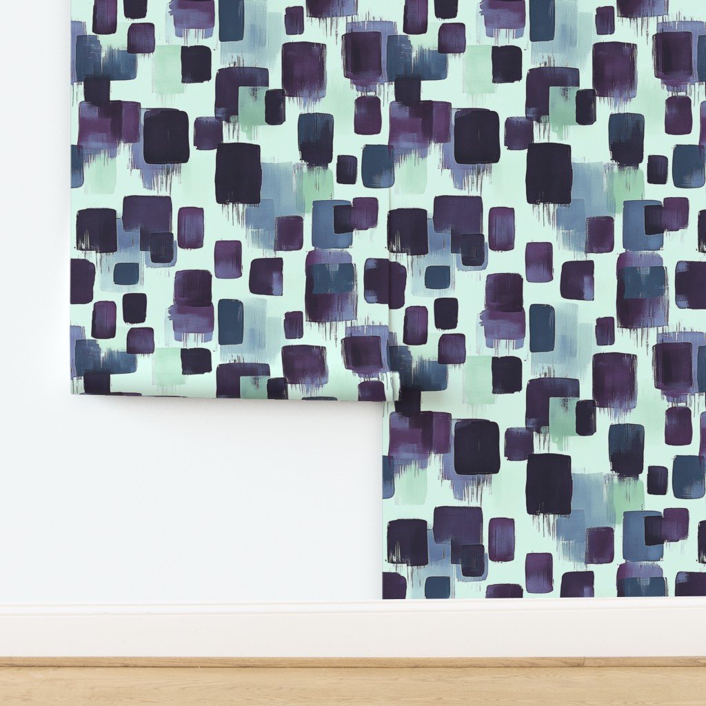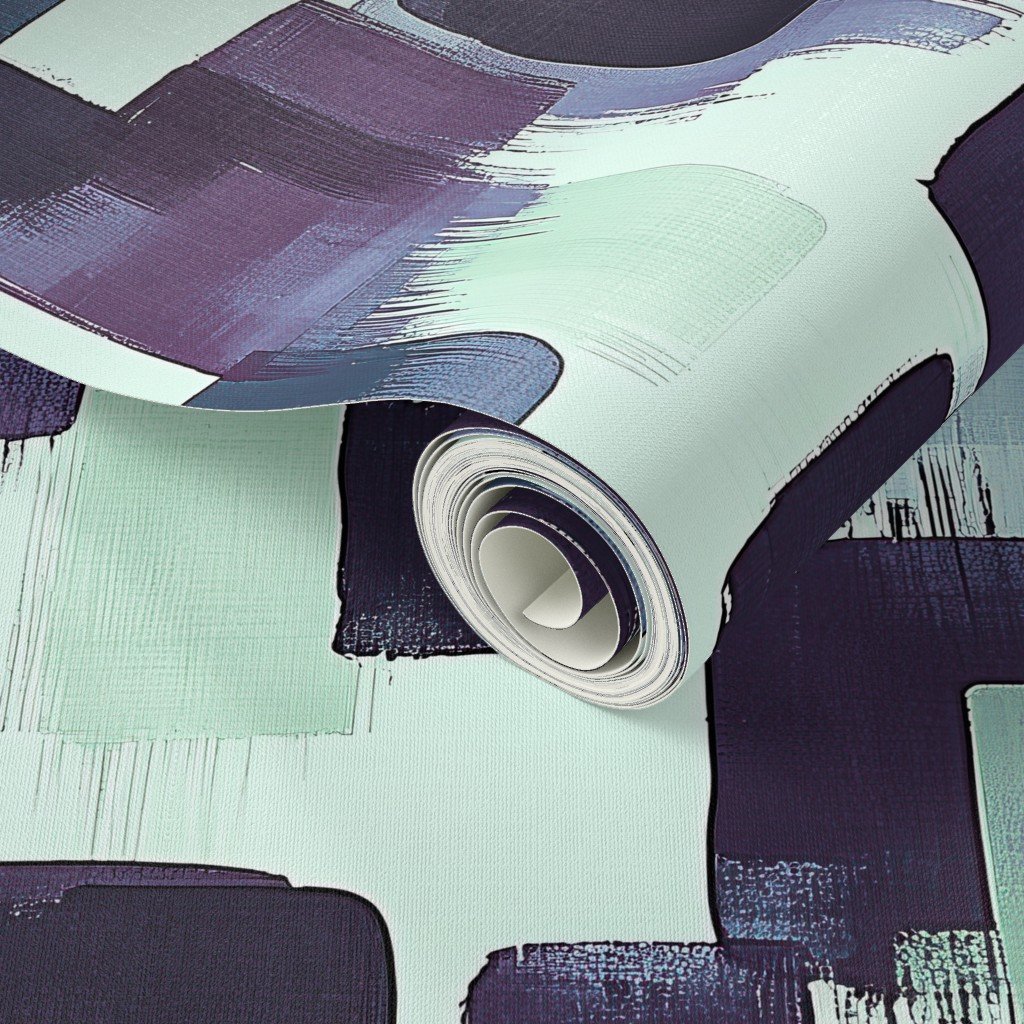 An abstract pattern with bold brushstroke blocks in deep purple and teal on a soft cream background, perfect for contemporary decor.