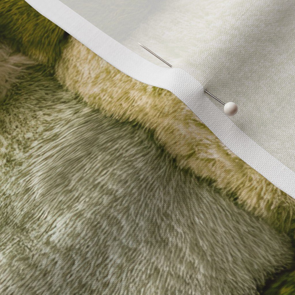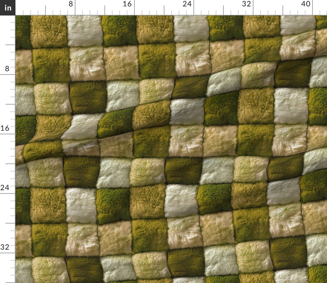 Forest green and ivory faux fur patchwork fabric features a serene blend of rich green tones and creamy ivory hues