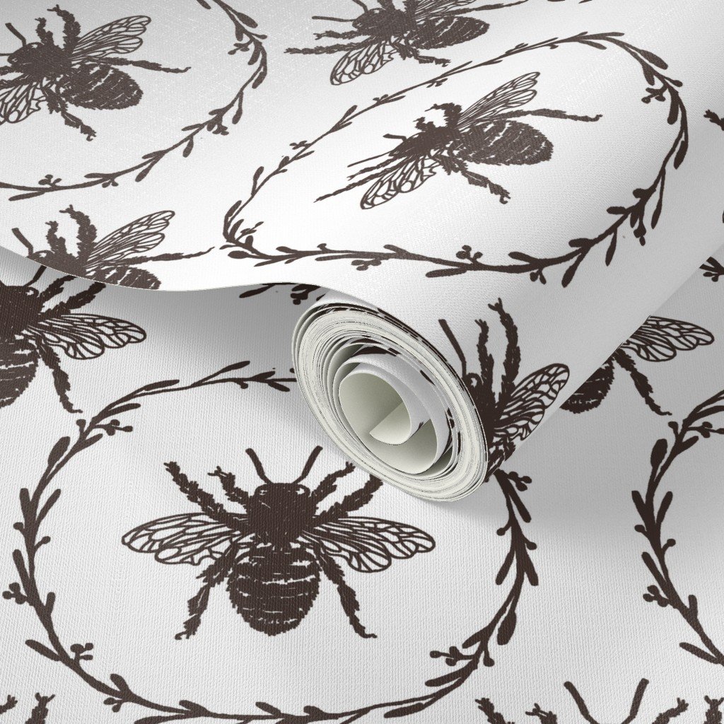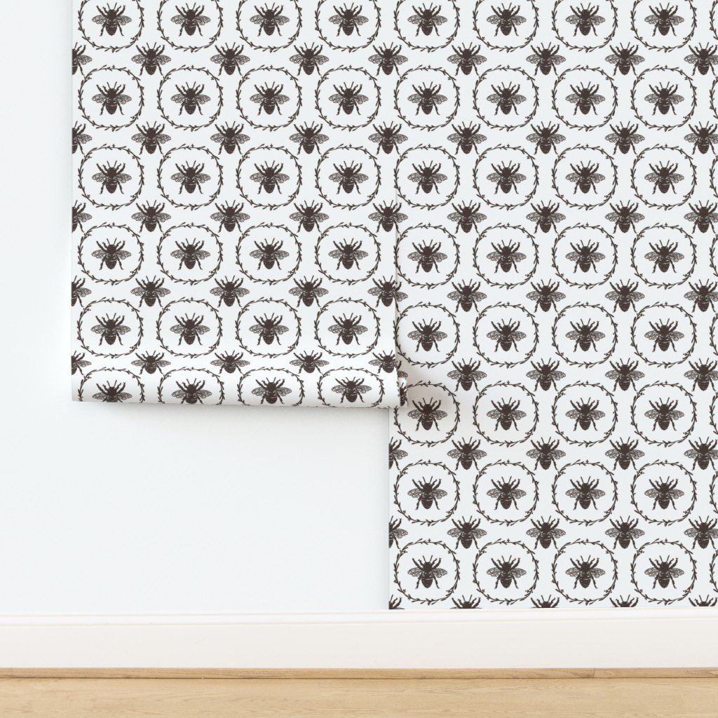 Monochrome large chocolate bees encircled in a laurel wreath are repeated in a uniform pattern in vintage French Provincial style on white.