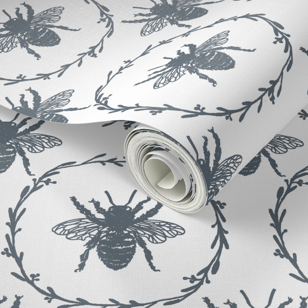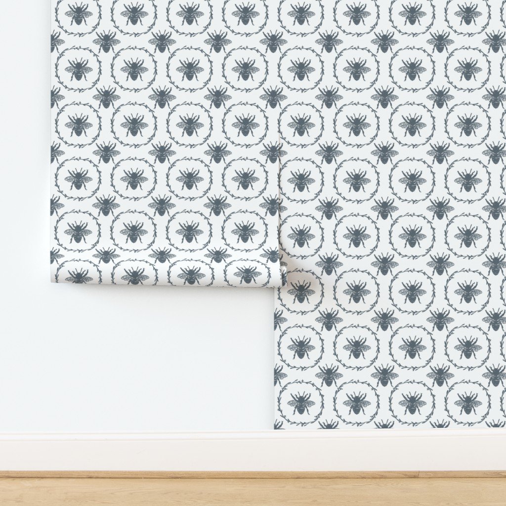 Monochrome large ice blue bees encircled in a laurel wreath are repeated in a uniform pattern in vintage French Provincial style on white.