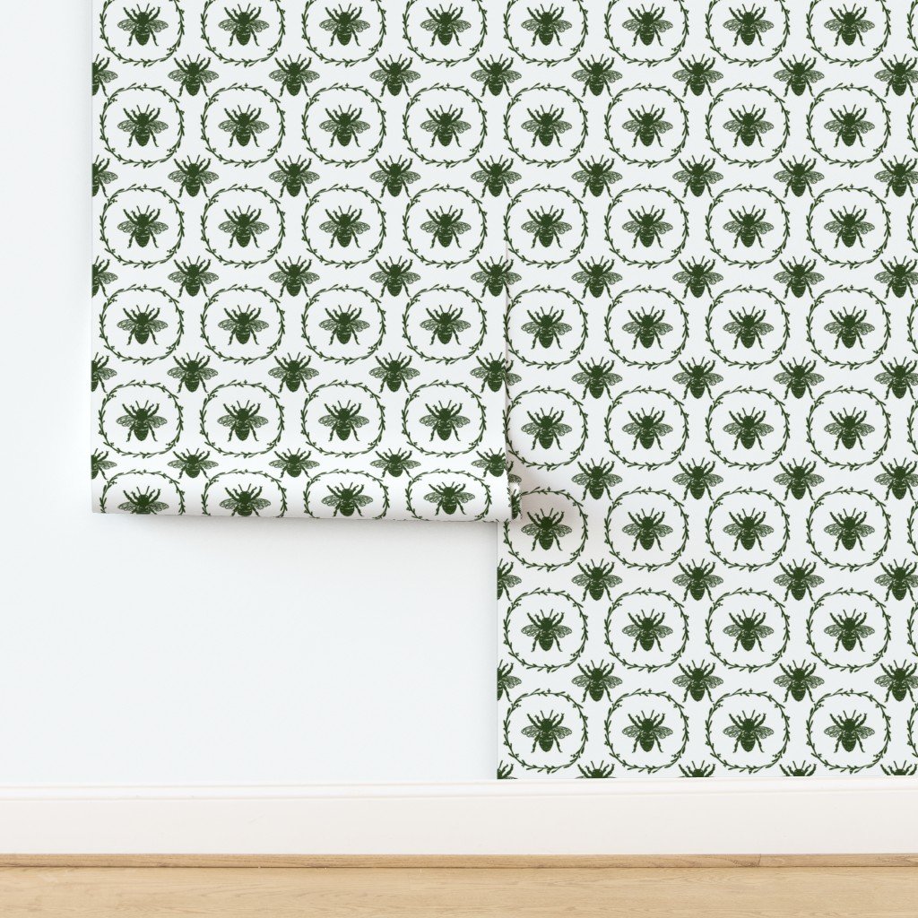 Monochrome large lichen green bees encircled in a laurel wreath are repeated in a uniform pattern in vintage French Provincial style on white.