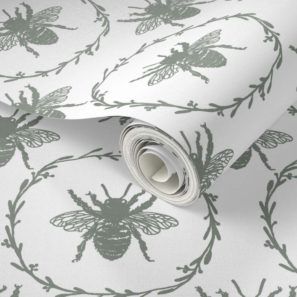 Be the first to review “Large French Provincial Bees in Laurel Wreaths in Sage Green on White Wallpaper”
