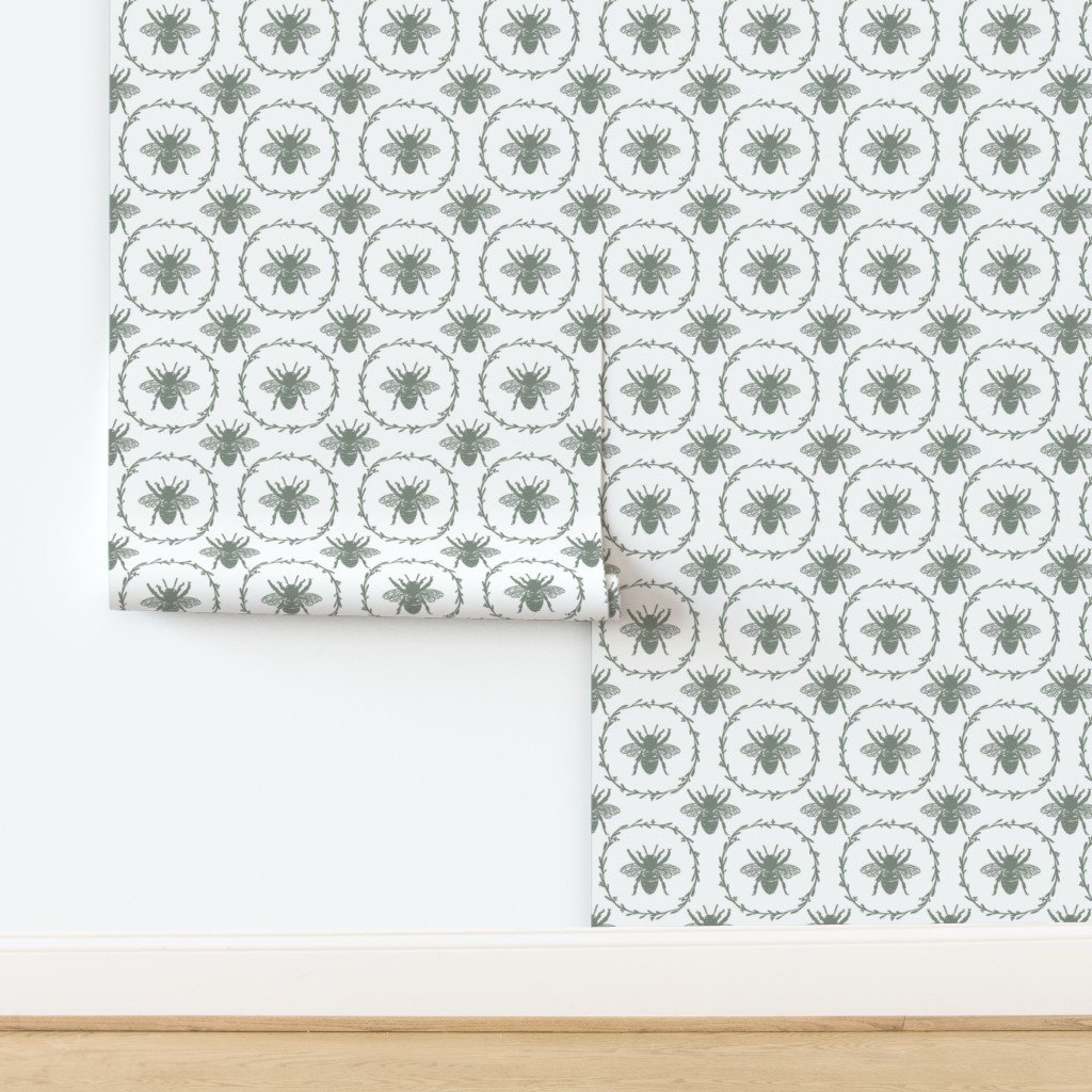 Monochrome large sage green bees encircled in a laurel wreath are repeated in a uniform pattern in vintage French Provincial style on white.