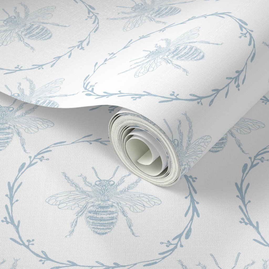 Monochrome large sky blue bees encircled in a laurel wreath are repeated in a uniform pattern in vintage French Provincial style on white.