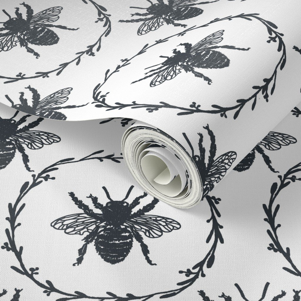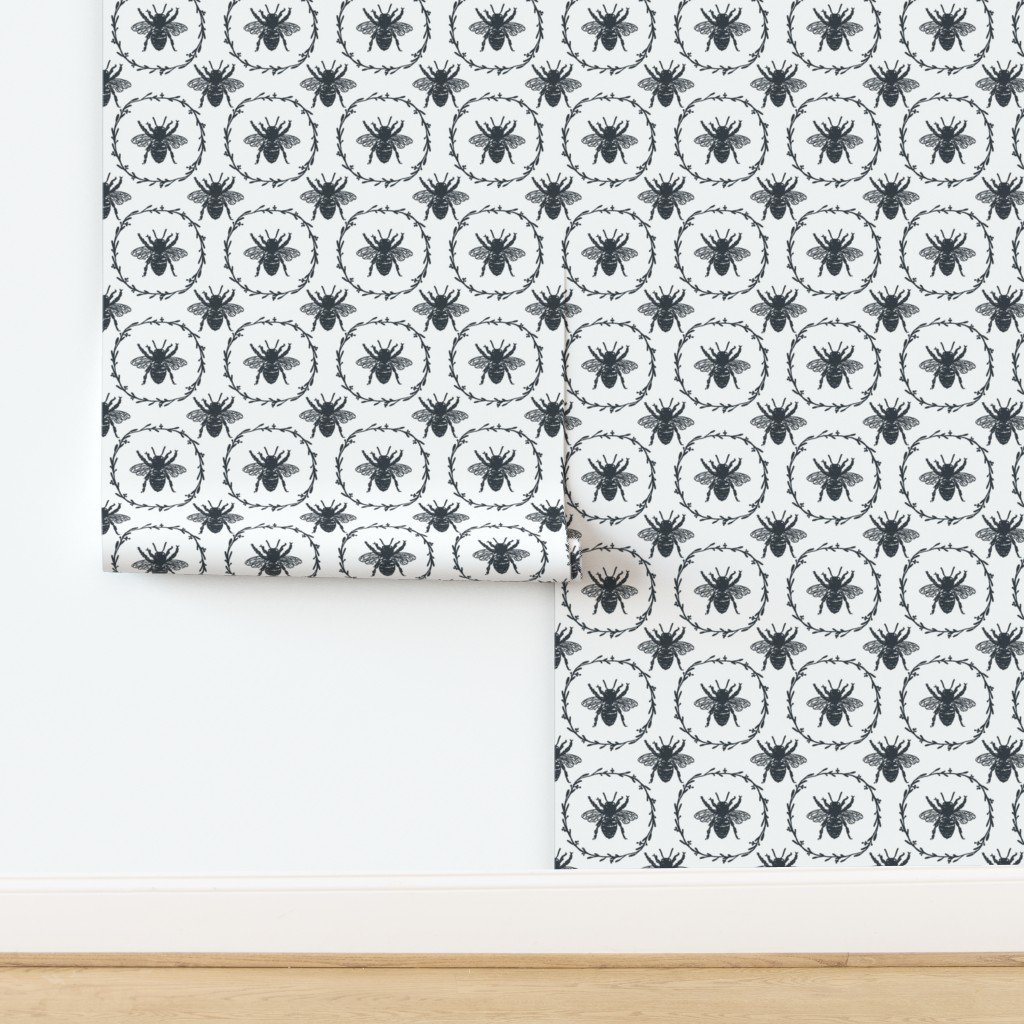 Monochrome large twilight blue bees encircled in a laurel wreath are repeated in a uniform pattern in vintage French Provincial style on white.