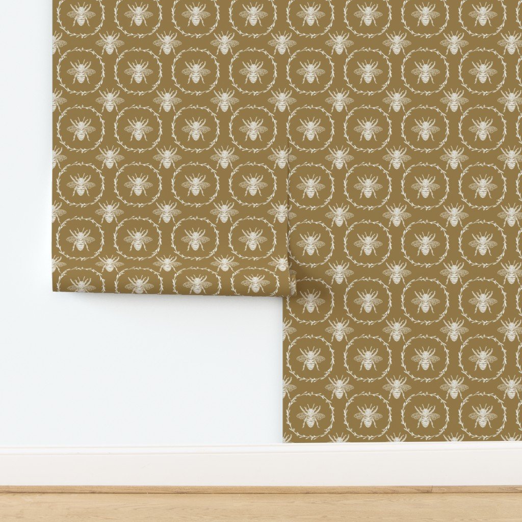 Monochrome large white bees encircled in a laurel wreath are repeated in a uniform pattern in vintage French Provincial style on tan.