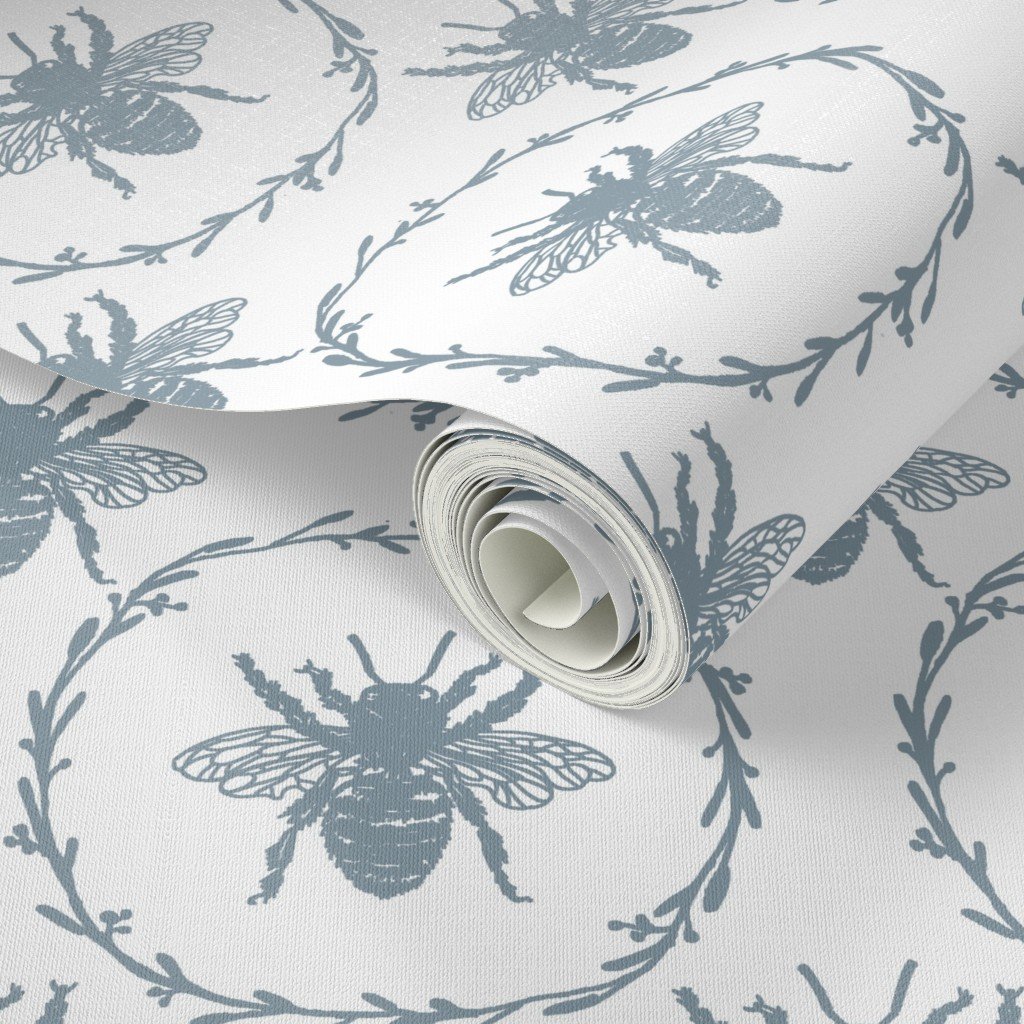 Monochrome large winter blue bees encircled in a laurel wreath are repeated in a uniform pattern in vintage French Provincial style on white.