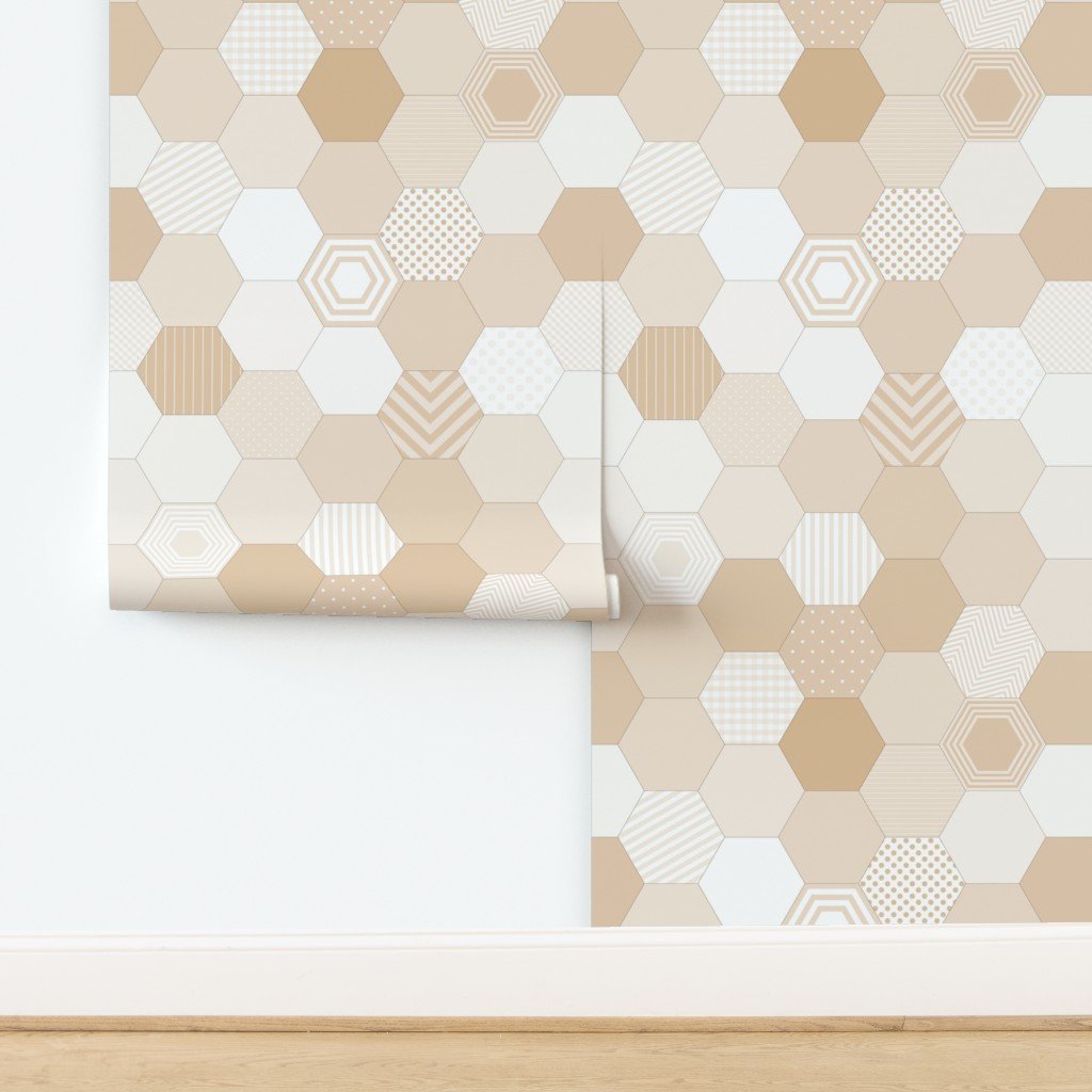 This design showcases a seamless pattern of hexagons in various shades of beige and tan. The hexagons are arranged in a honeycomb structure with rando