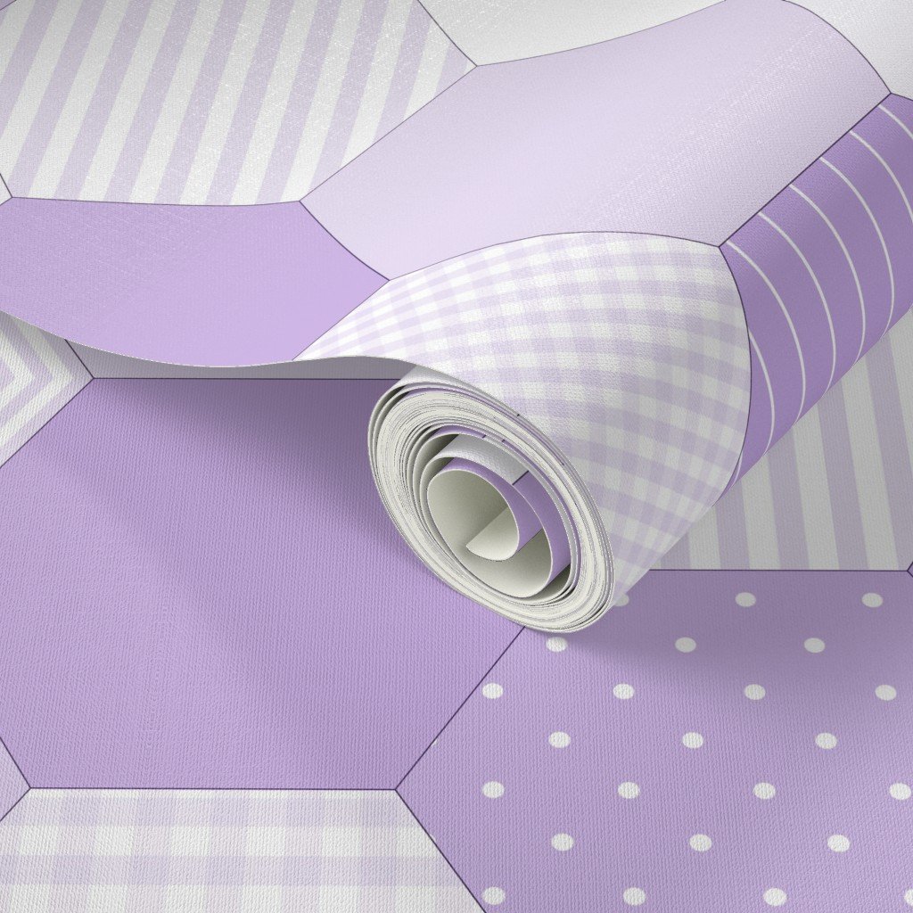 This design presents a seamless pattern of hexagons in a range of lavender tones . The hexagons are arranged in a honeycomb structure with random whit