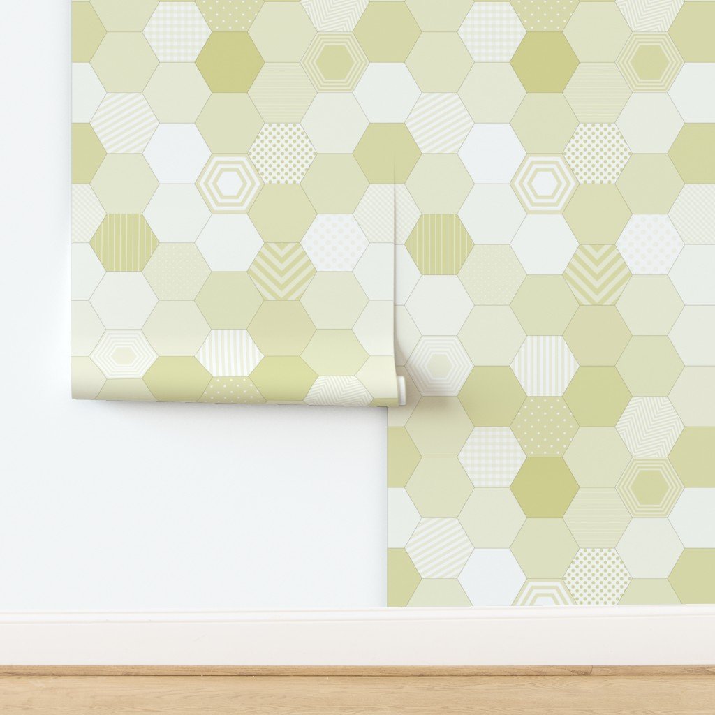 This design displays a seamless pattern of hexagons in various shades of soft yellow. The hexagons are arranged in a honeycomb structure with random w