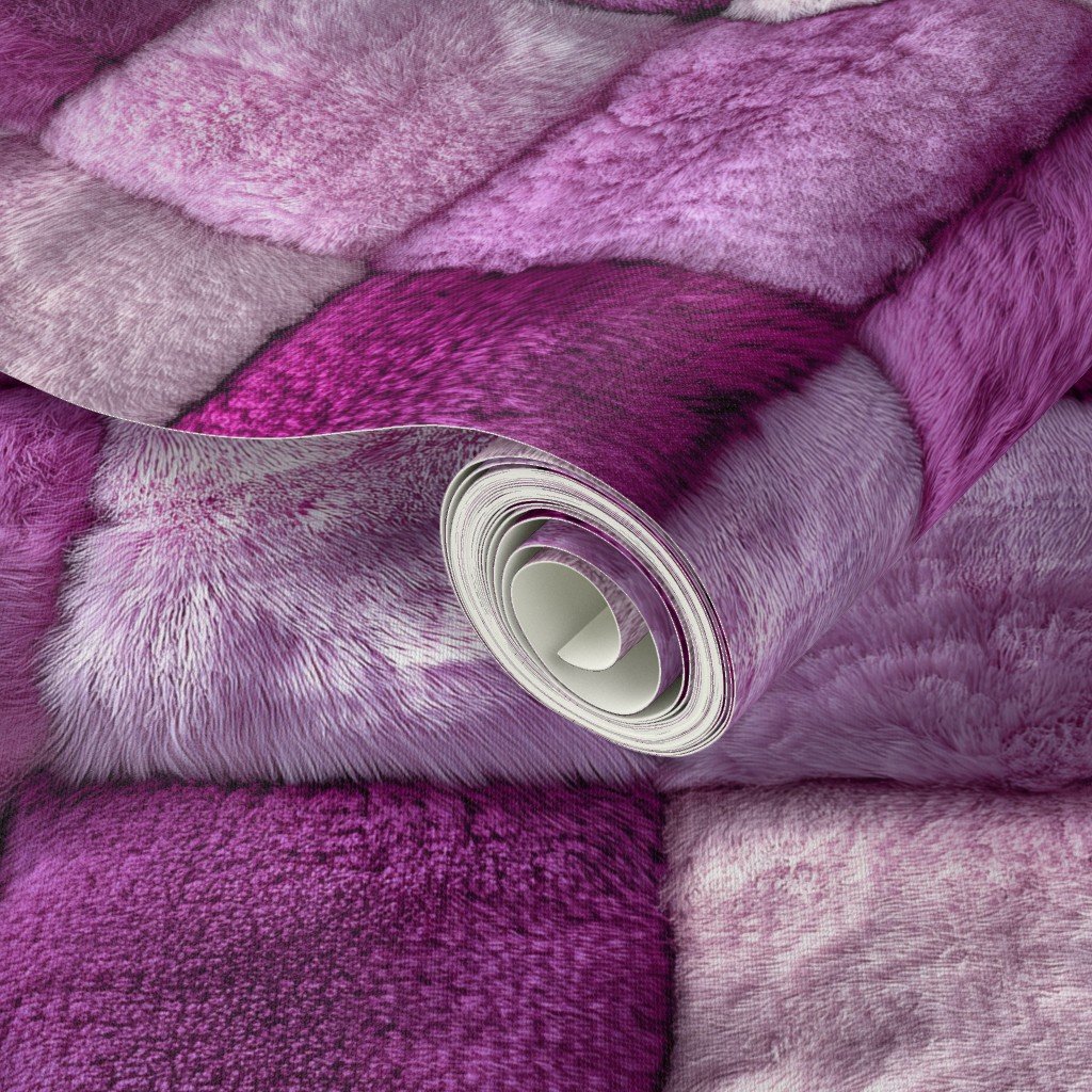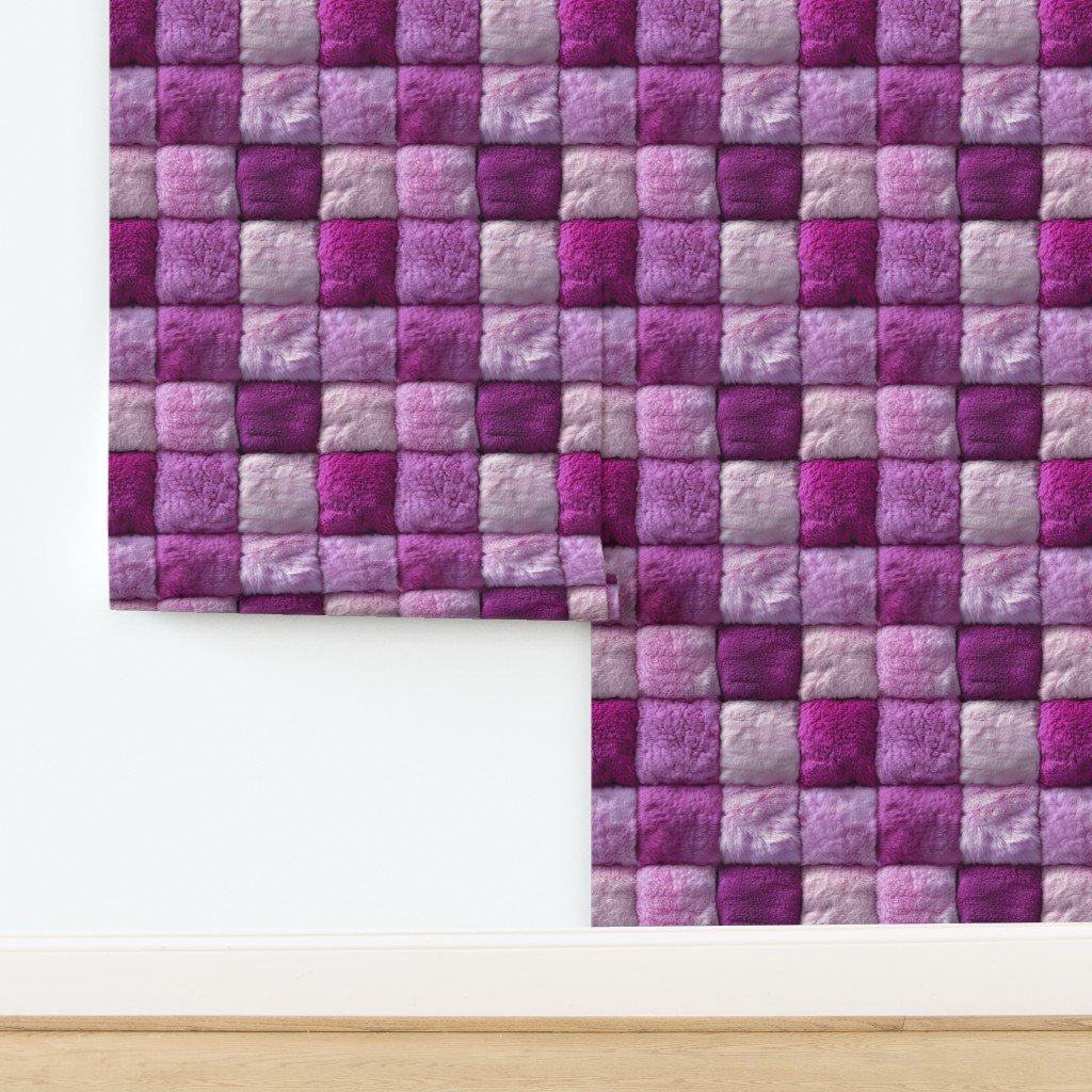This magenta and pink faux fur patchwork fabric offers a vibrant combination of deep magenta and soft pink hues.