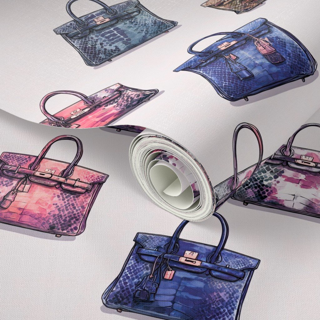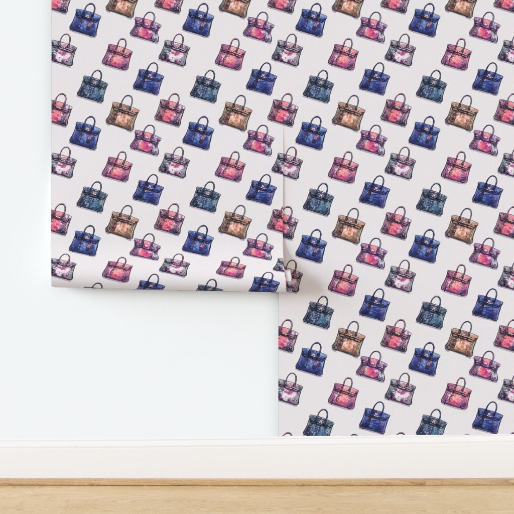 A decorative repeat of illustrated handbags rendered in warm jewel shades of gold, olive green, amber, and deep magenta. The textured, hand-painted look adds depth and character, creating a statement pattern with a confident, editorial aesthetic.