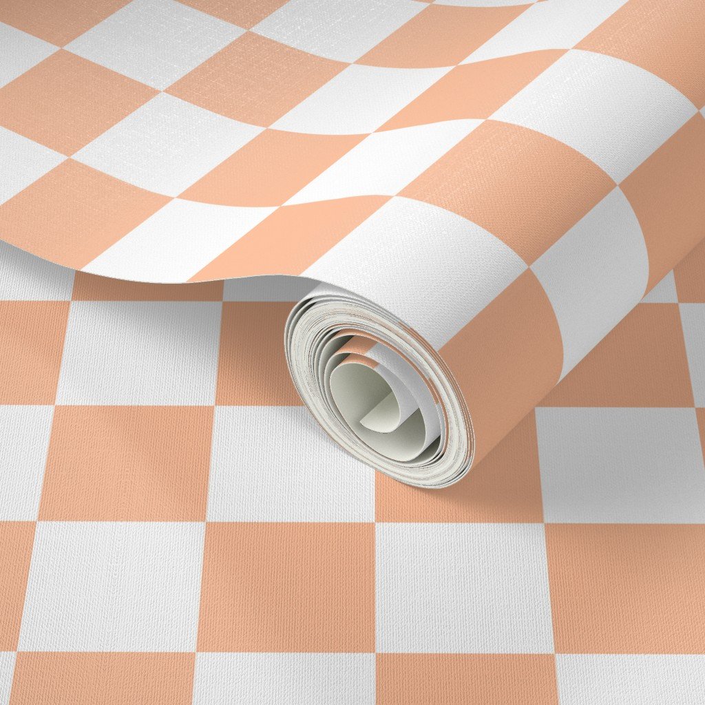 Peach Fuzz Color of the Year 2024 and medium white checkerboard checks expresses a nurturing, embracing and velvety peach tone to soothe mind, body, a