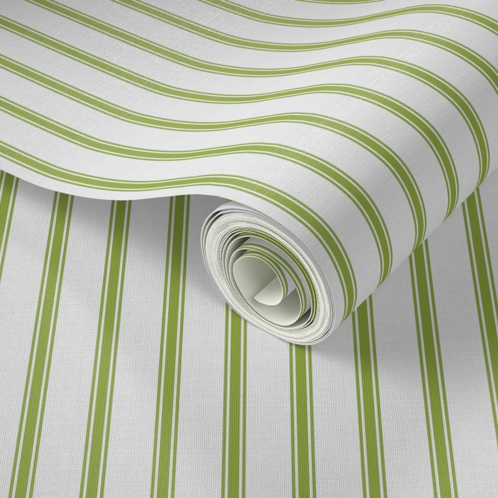 Stitched and woven straight vertical lines of one grass green stripe either side of a medium stripe in off-white are seen in French provincial