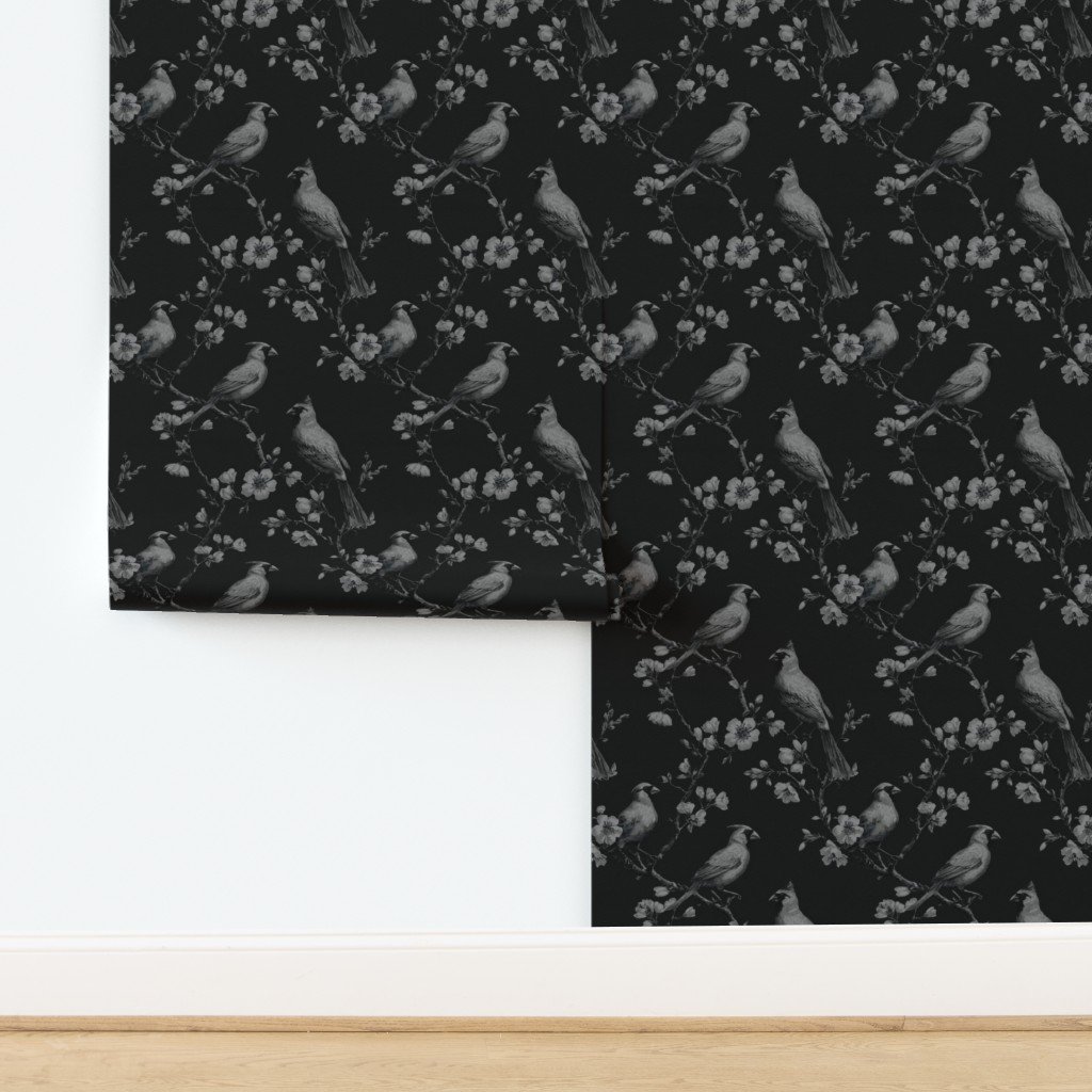 Midnight Black Orchard Cardinal Toile Botanical Bird Pattern Wallpaper