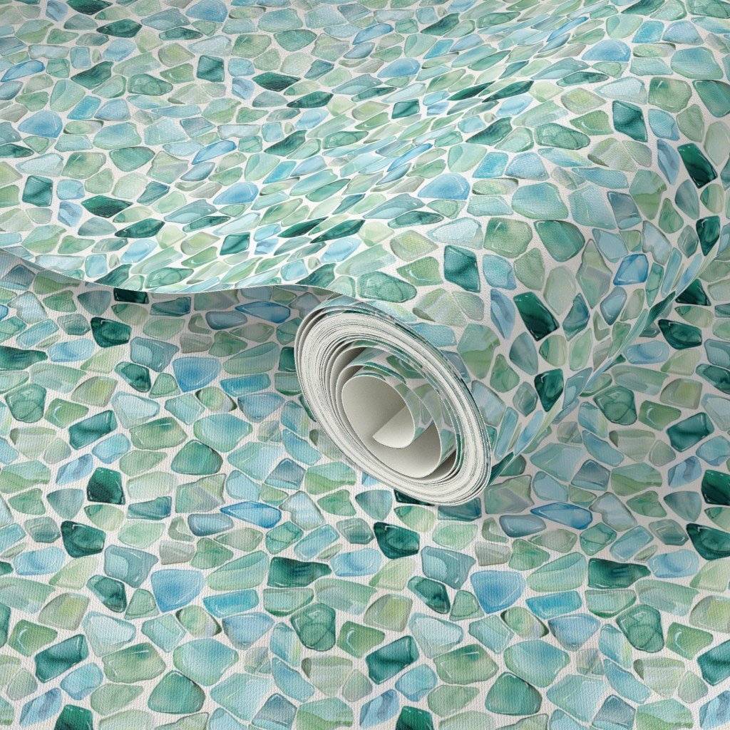 Mini-scale watercolor sea glass shards in soft blue and aqua tones, inspired by tumbled and scattered coastal glass. A fresh, beach-inspired pattern ideal for fabric, quilting, accessories, and light coastal décor.