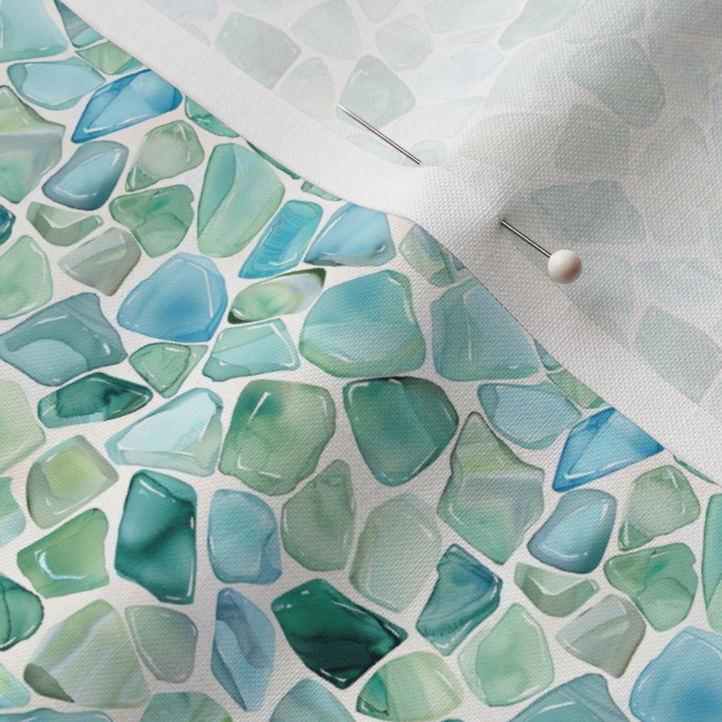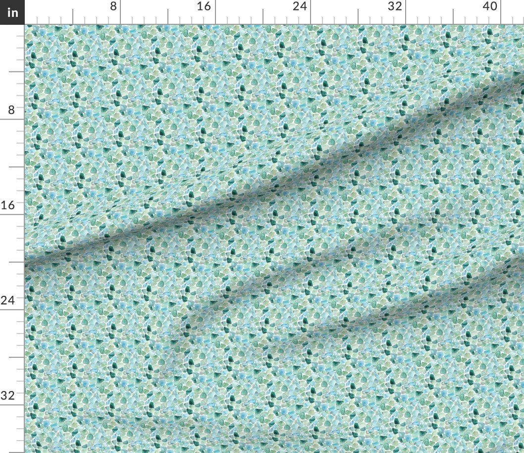 Mini-scale watercolor sea glass shards in soft blue and aqua tones, inspired by tumbled and scattered coastal glass. A fresh, beach-inspired pattern ideal for fabric, quilting, accessories, and light coastal décor.