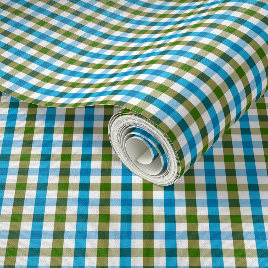 A fresh country cottage gingham check in shades of blue, light blue, green, olive green, and white.