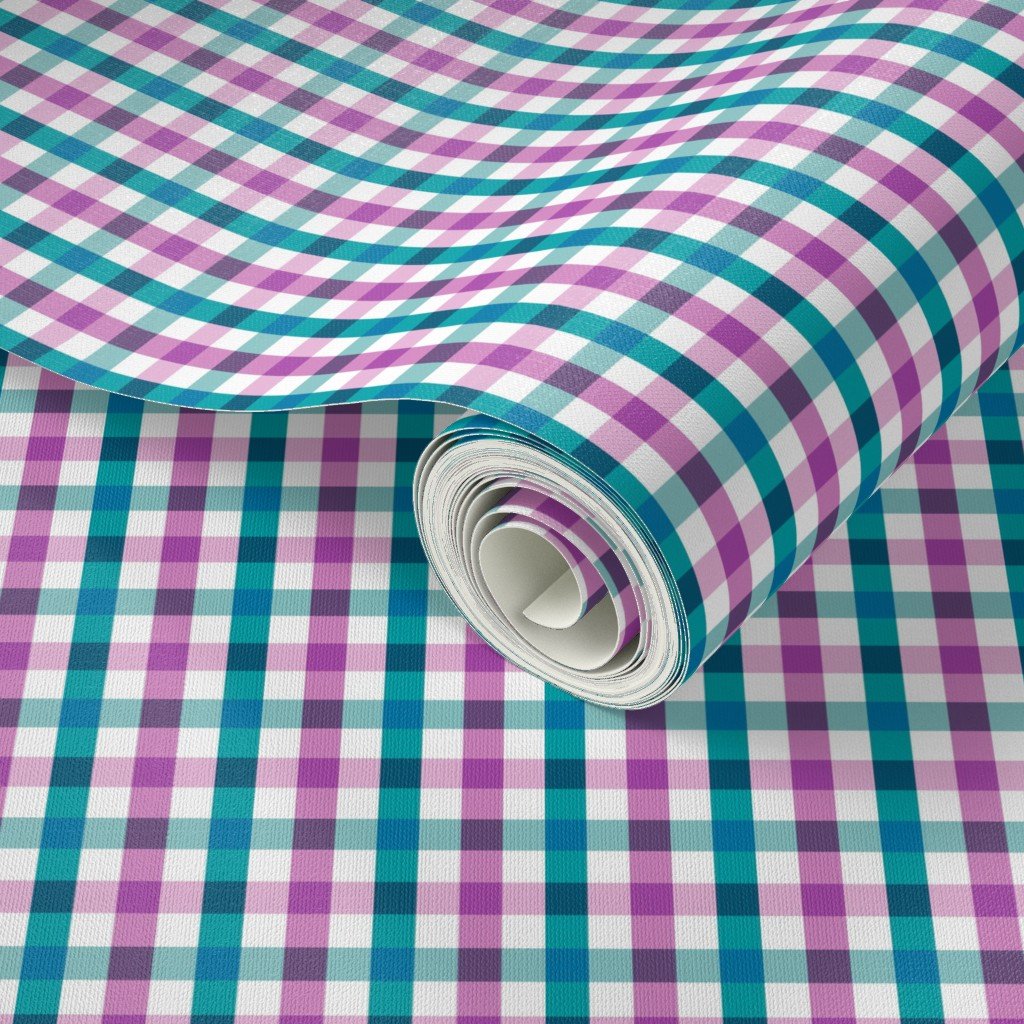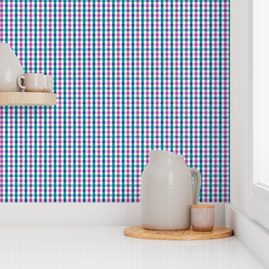 A fresh country cottage gingham check in shades of teal, light blue, pink, purple, and white.