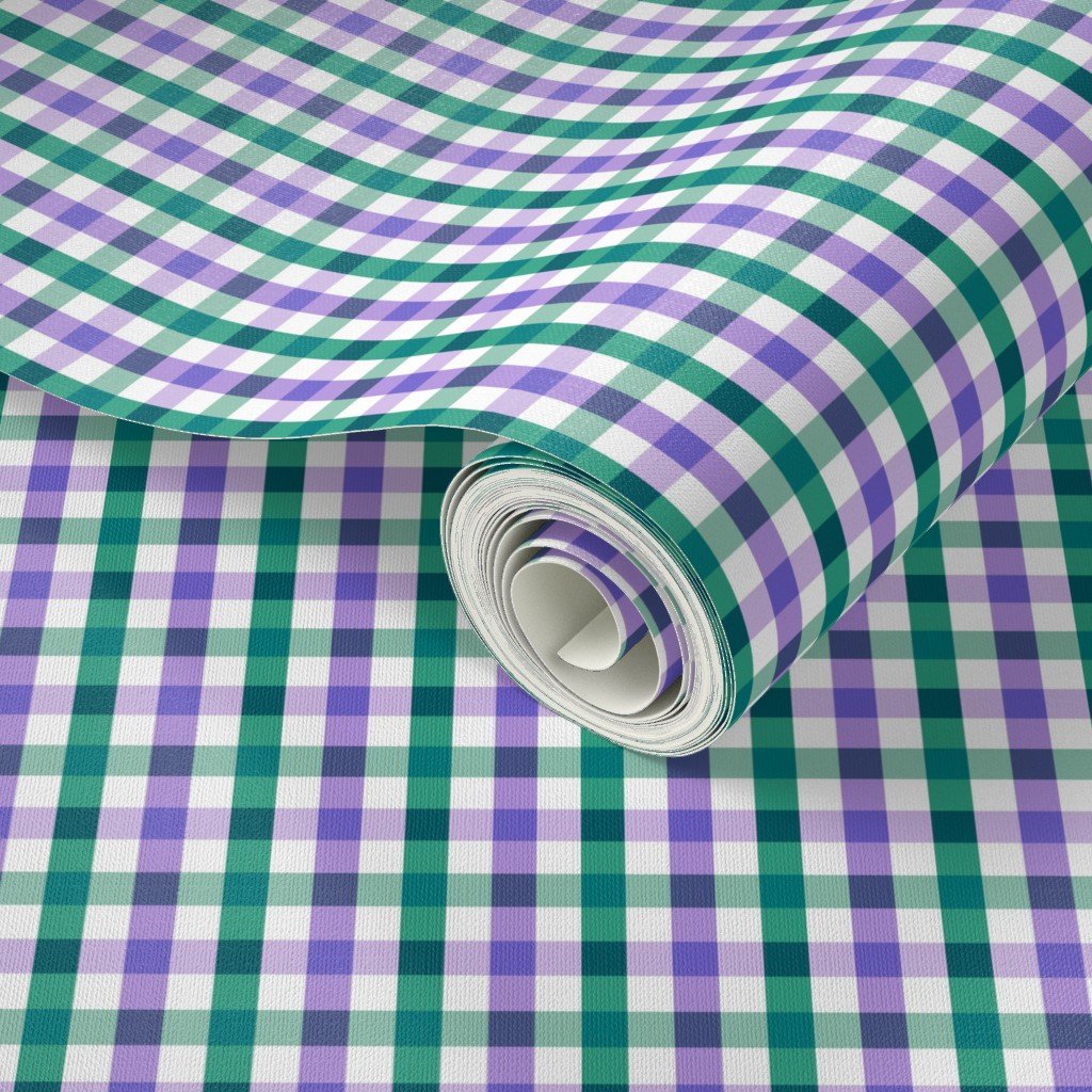 A fresh country cottage gingham check in shades of teal, light green, lavender, purple, and white.
