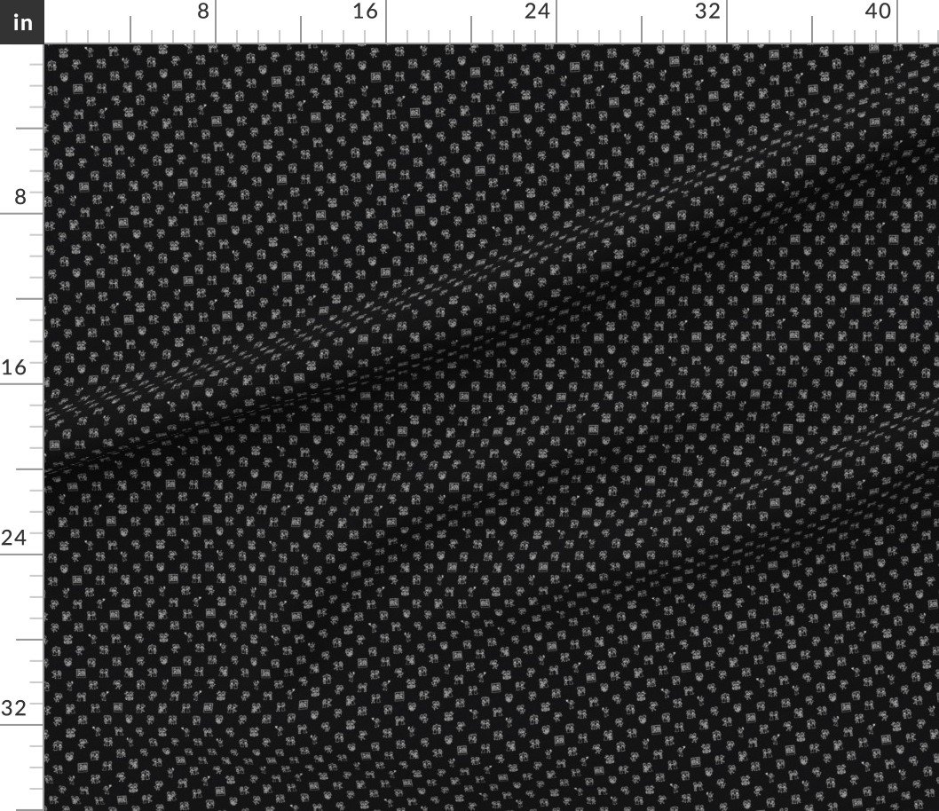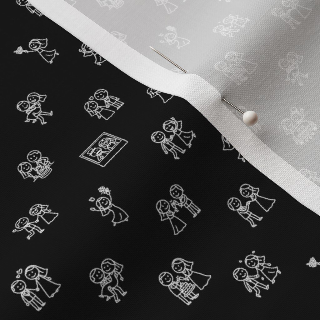 A playful mini-scale wedding design featuring white-on-black stick figure doodles in fun romantic scenes—just married cars, dancing couples, wedding cake, and more. Perfect for standout small-scale sewing, tags, or event details with bold contrast.