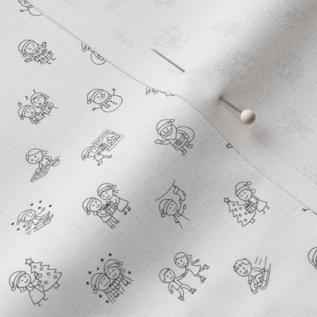 A tiny white on black holiday repeat filled with cheerful stick figure characters celebrating Christmas. At just ½ inch scale, these hand drawn doodles are perfect for small projects like gift tags, accessories, or festive fabric accents