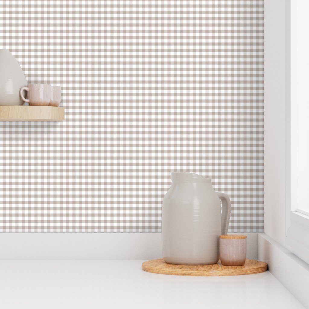 Classic gingham pattern in misty taupe and white adds cozy neutral style to fabric quilts cushions kitchen accents nursery decor vintage crafts and rustic home projects ideal for country cottage themes soft gray tones and timeless handmade interiors