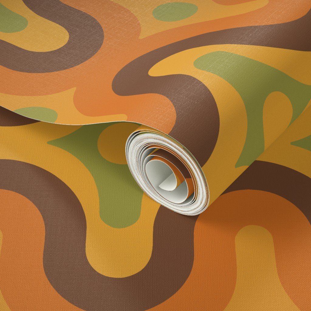 bold and groovy 1970s-inspired wallpaper design featuring undulating geometric waves in burnt orange, mustard yellow, avocado, and chocolate brown
