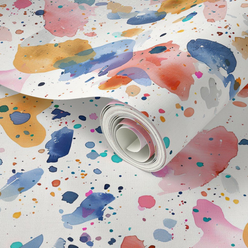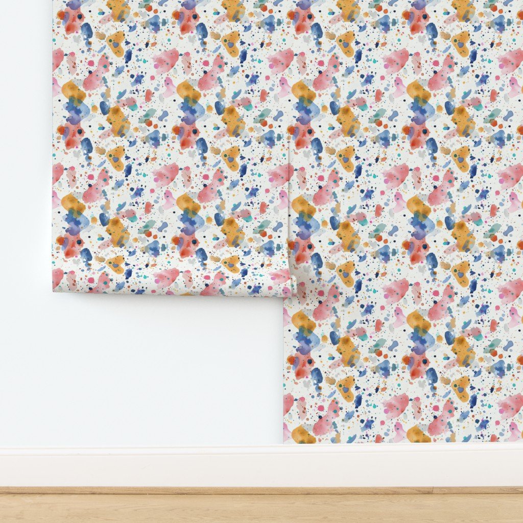 Watercolor splashes in mustard and pastel of broken and scattered terrazzo tile in a random repeat pattern