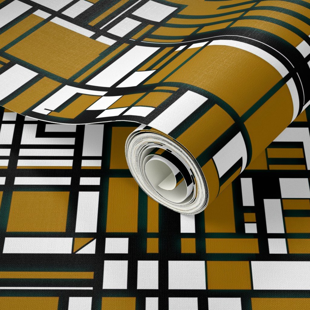 Mustard gold blocks shine against bold black lines and white space in this striking geometric city grid pattern with modern flair.